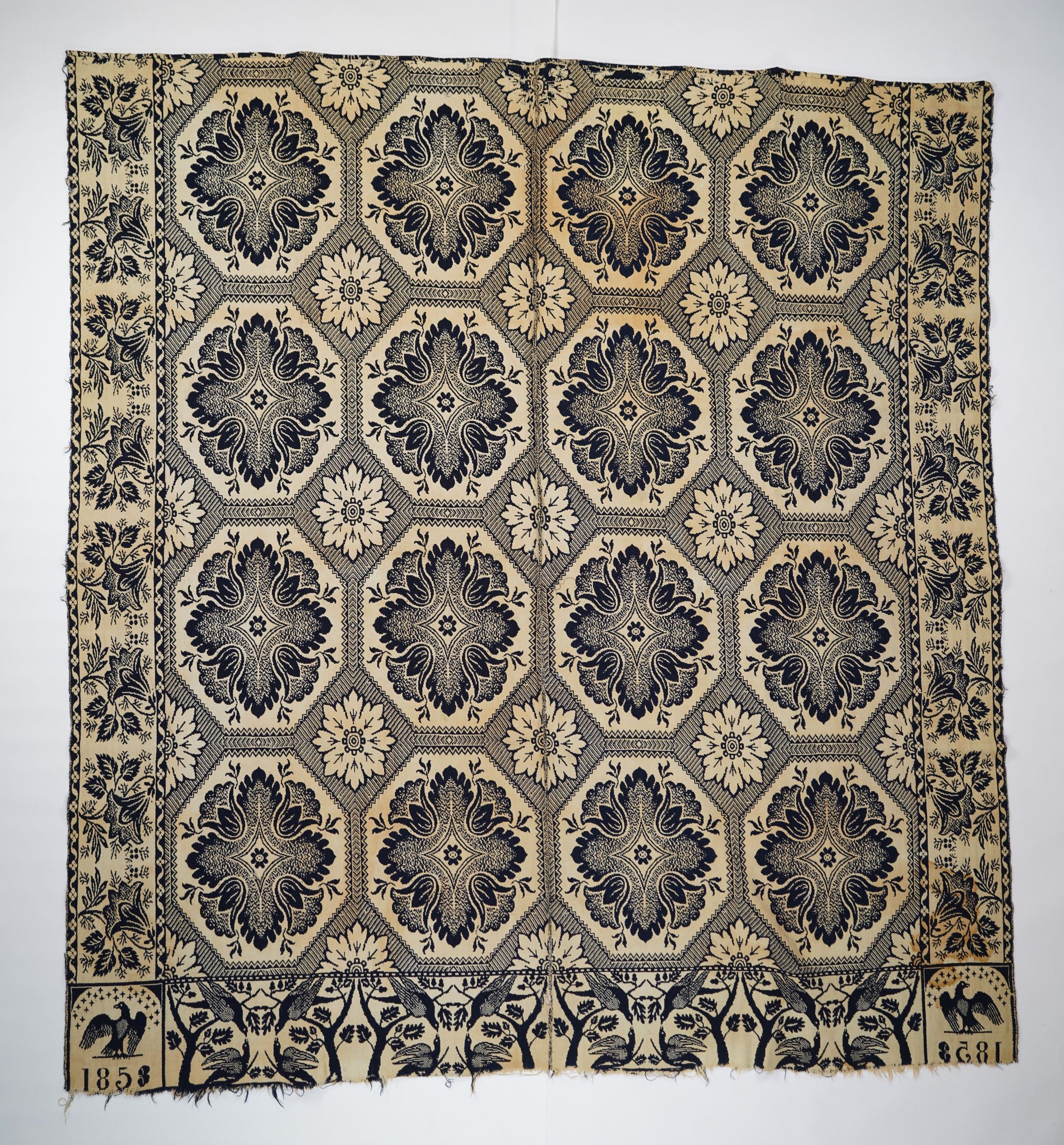 Navy and natural figured half doublecloth coverlet with border on three sides. Two joined panels. Woven by Matthew Rattray in Indiana in 1853 based on the cornerblock trademark.Collection