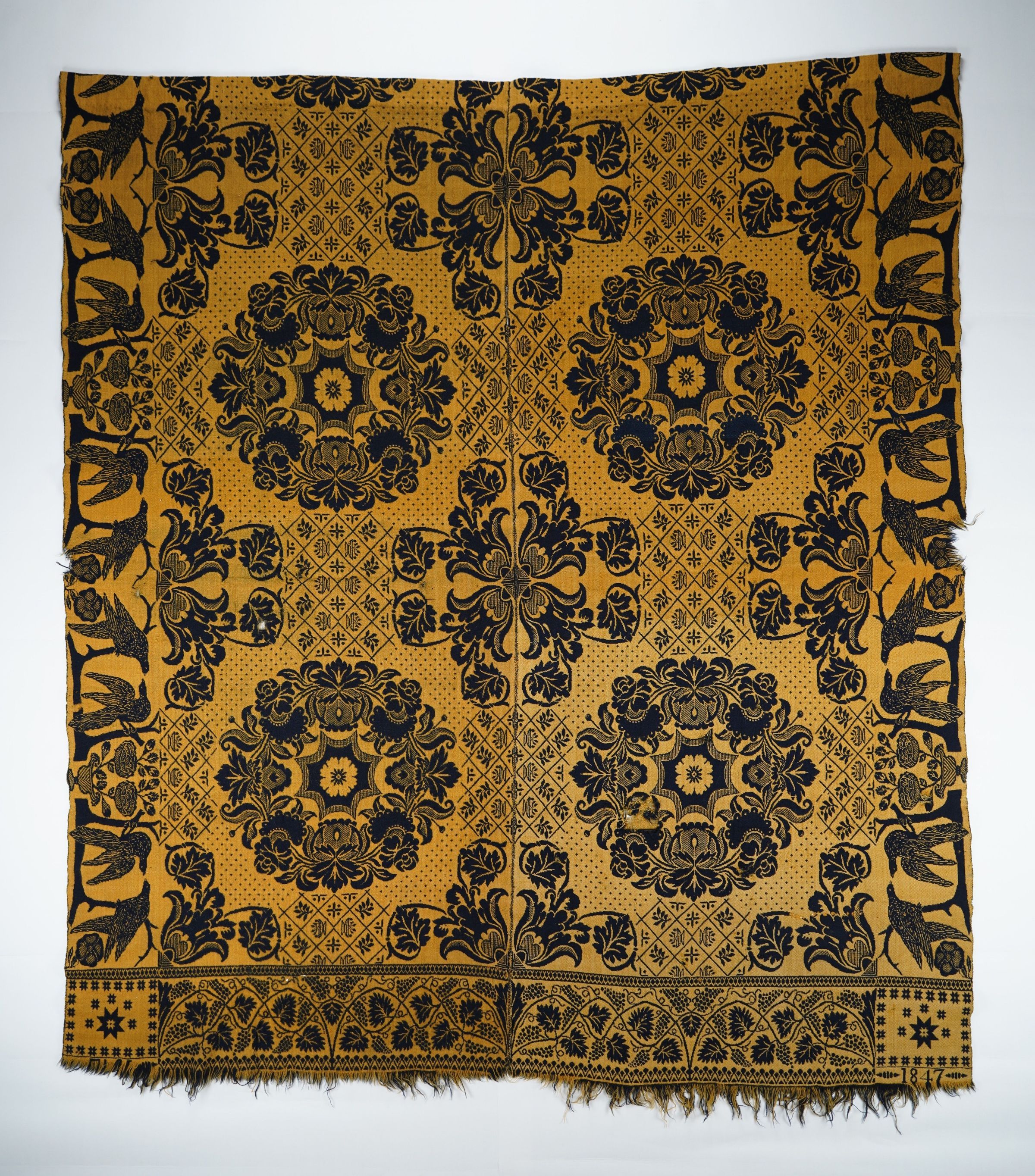 Yellow and navy figured doubleweave coverlet with border on three sides and self-fringe along bottom. Two joined panels. Woven by Samuel Stinger in Indiana in 1847, based on Starfield trademark.Context