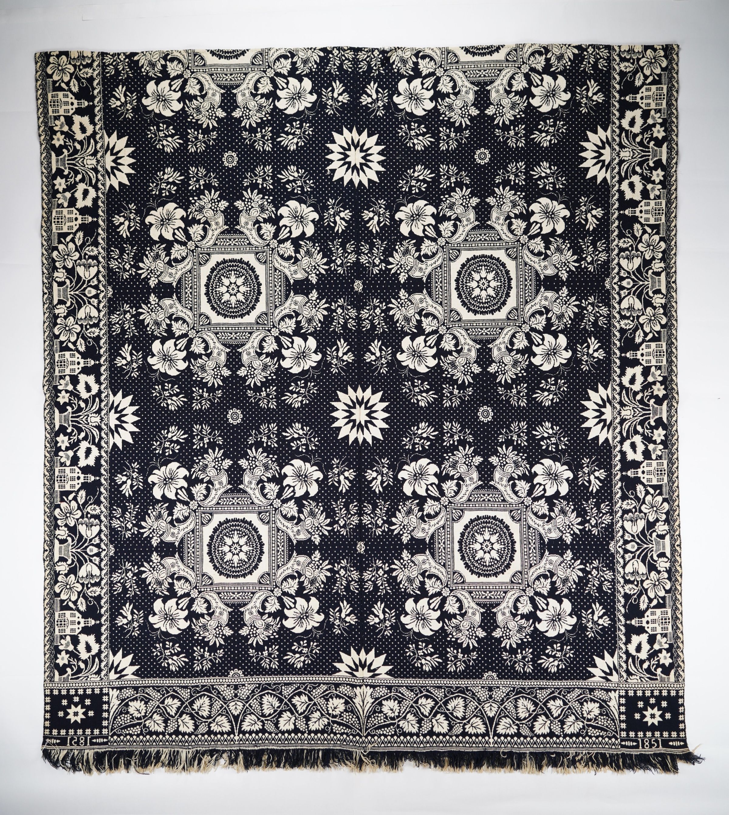 Navy and natural figured doubleweave coverlet with border on three side and self-fringe along bottom. Two joined panels. Woven by Samuel Stinger in Indiana in 1851, based on Starfield trademark.Context