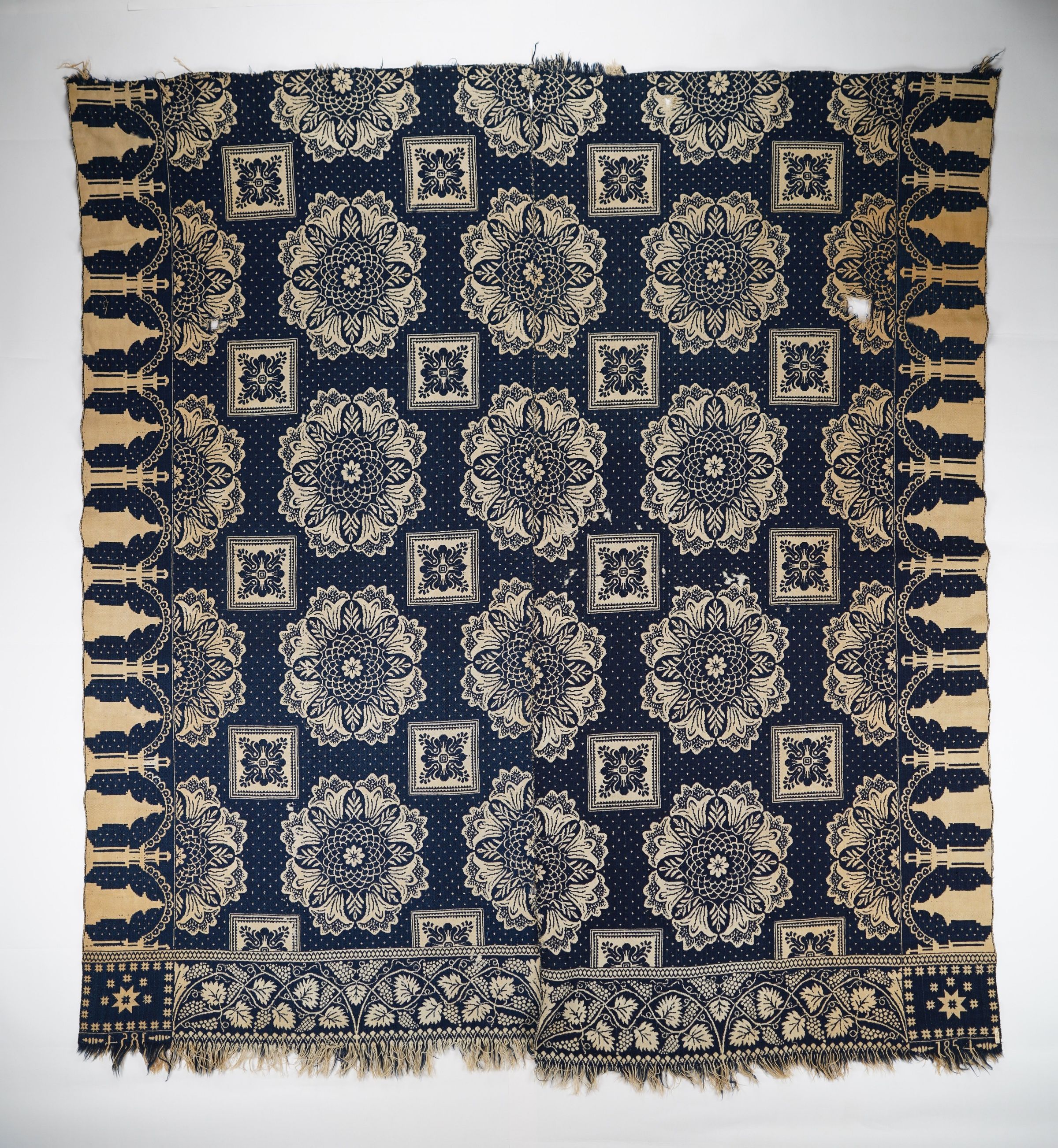 Navy and natural figured doubleweave coverlet with border on three side and self-fringe along bottom. Two joined panels. Woven by Samuel Stinger in Indiana in 1854, based on Starfield trademark.Context