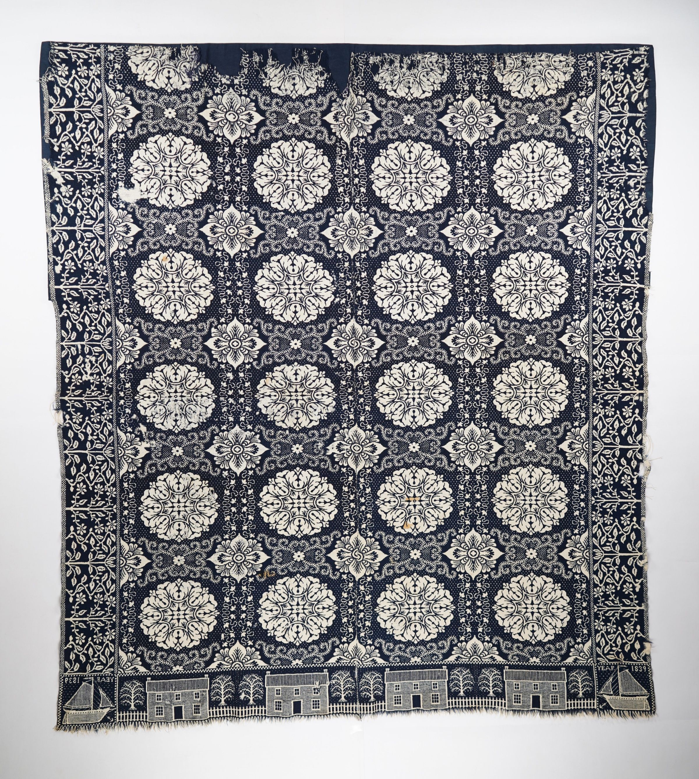 Figured and fancy doubleweave coverlet with borders on 3 sides and self-fringe on both sides and bottom. Two panels joined by a center seam. Navy wool with undyed cotton. Floral medallion centerfield pattern; floral border on sides; log cabin border on bottom. Woven by the Gilmour Family in 1839 with sailboat trademark in cornerblock.Context
