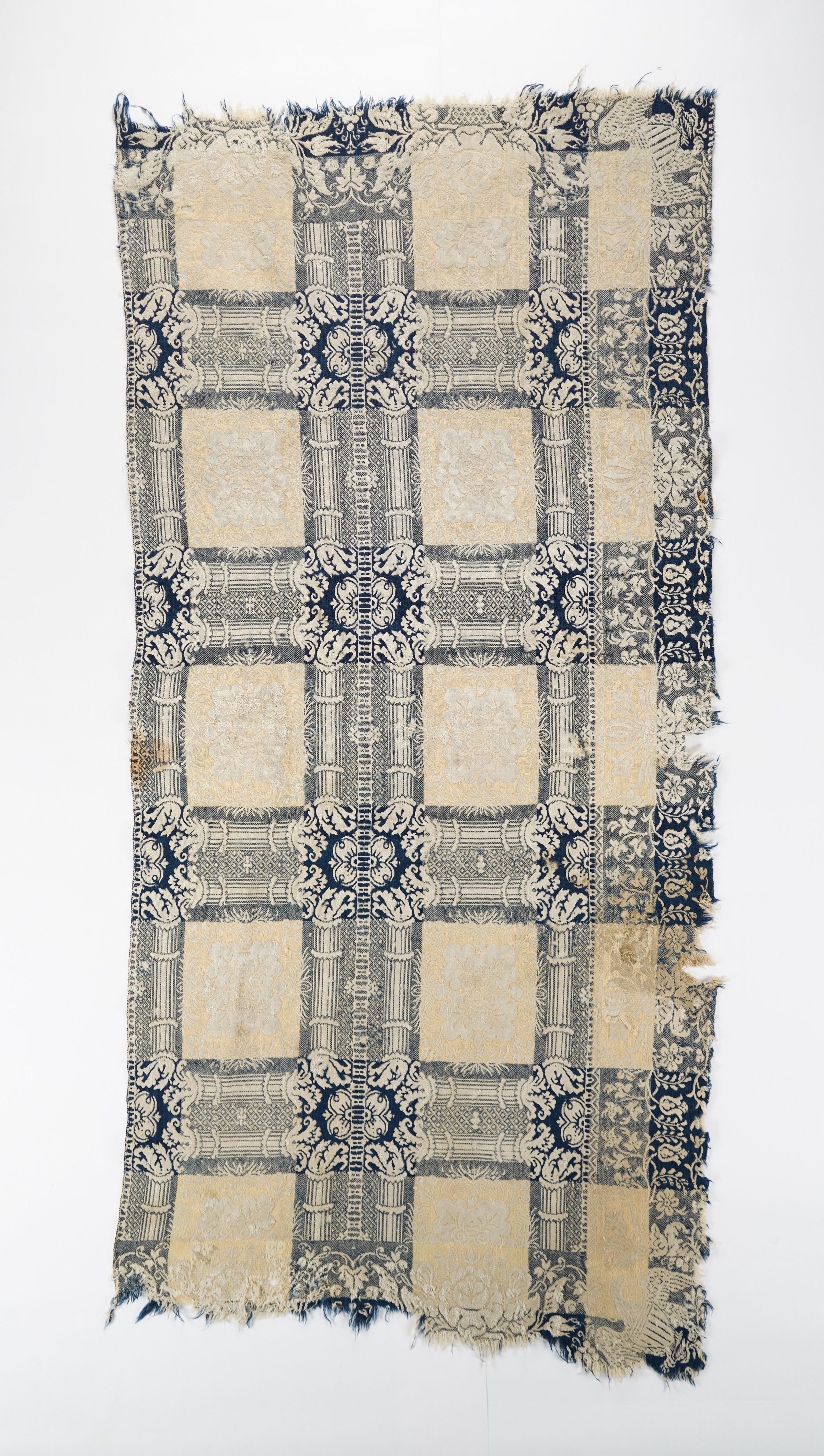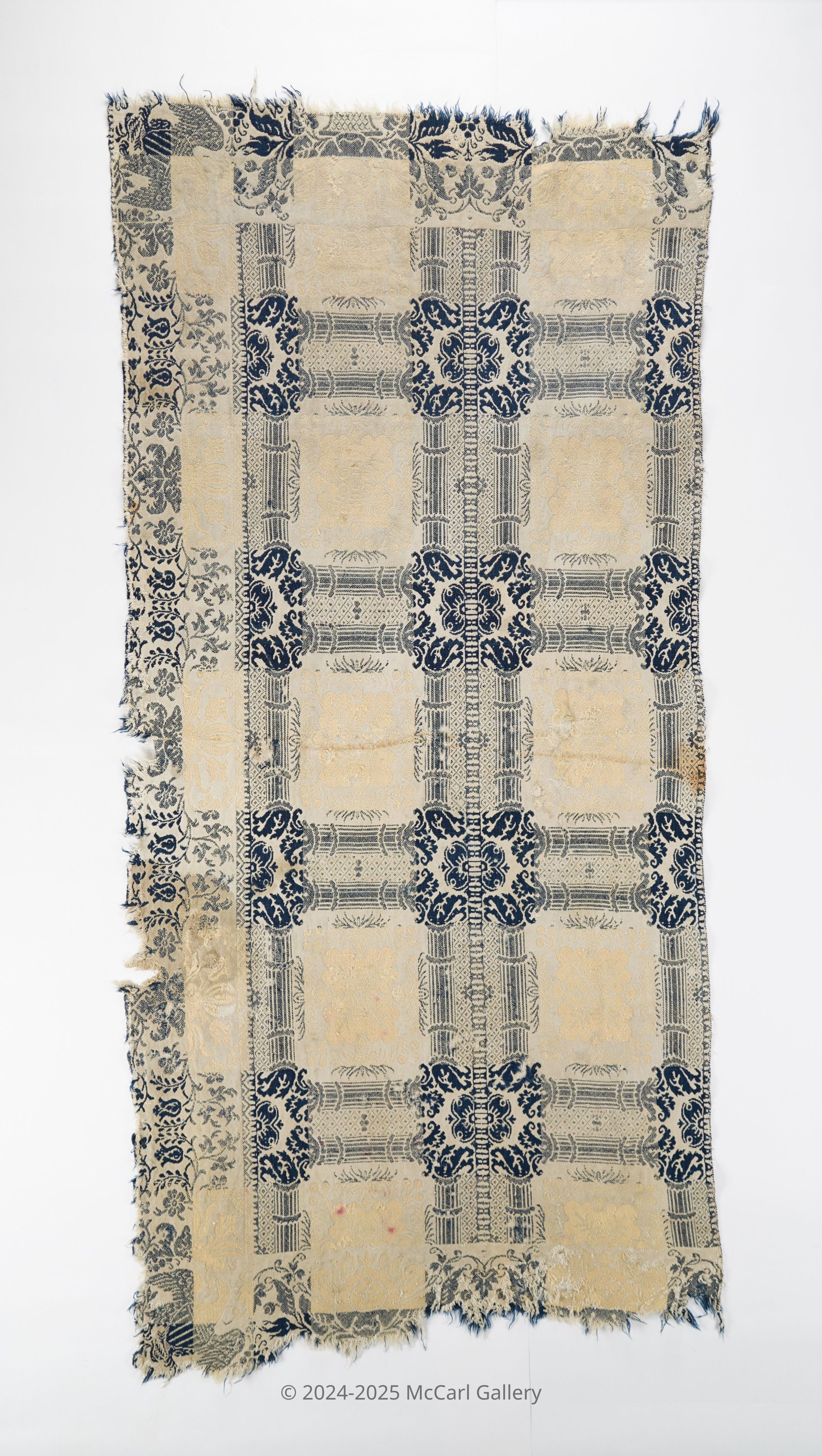 Navy, tan, and natural figured doubleweave coverlet attributed to Thomas Cranston.Collection