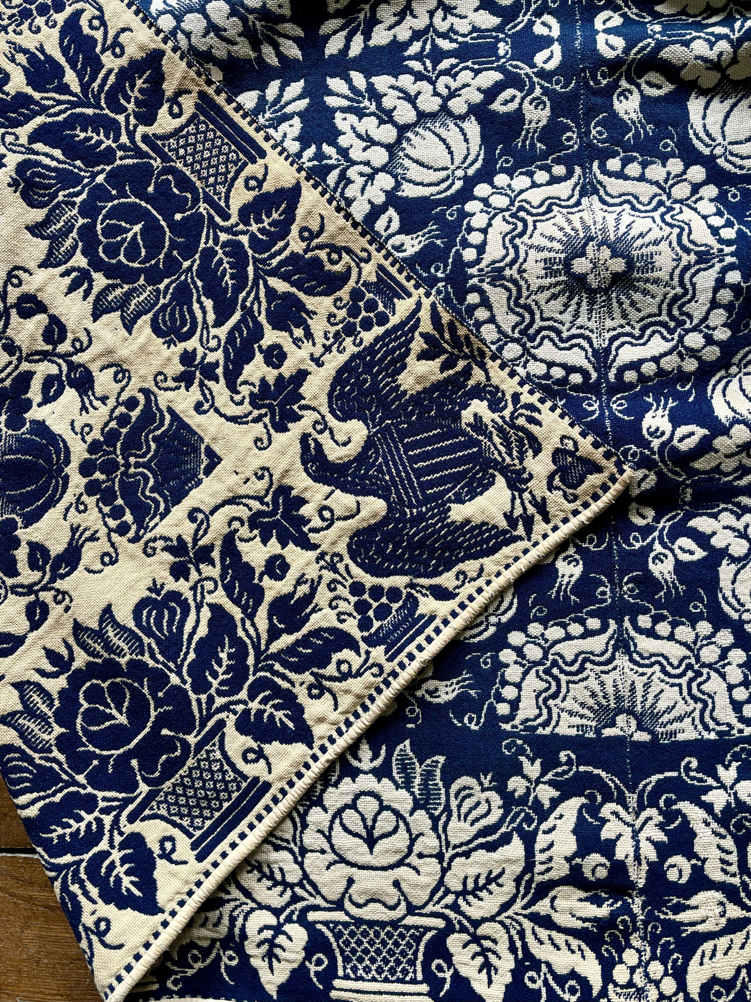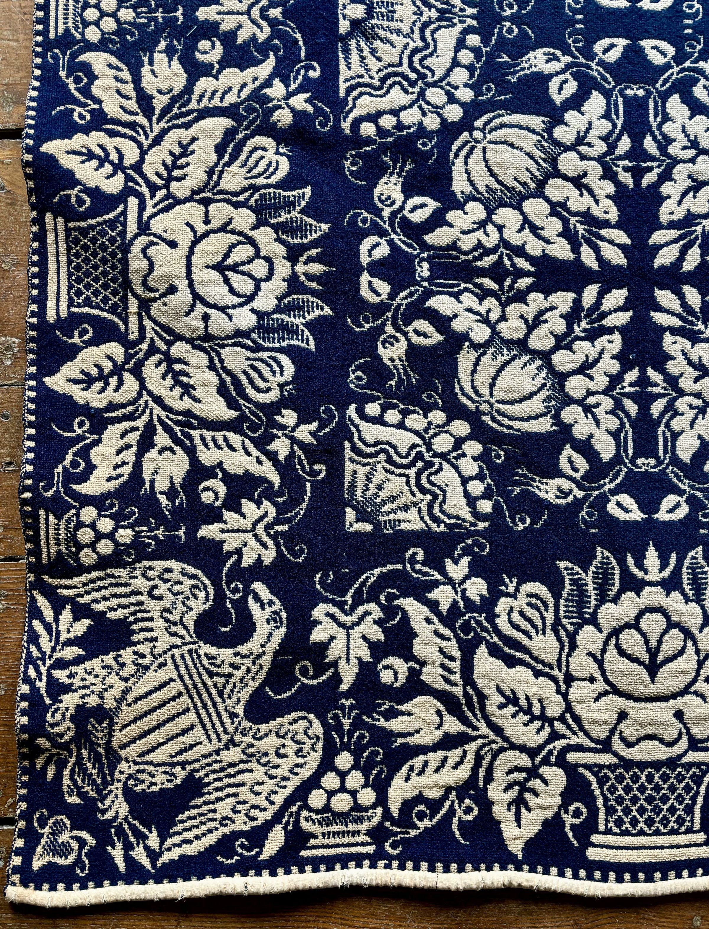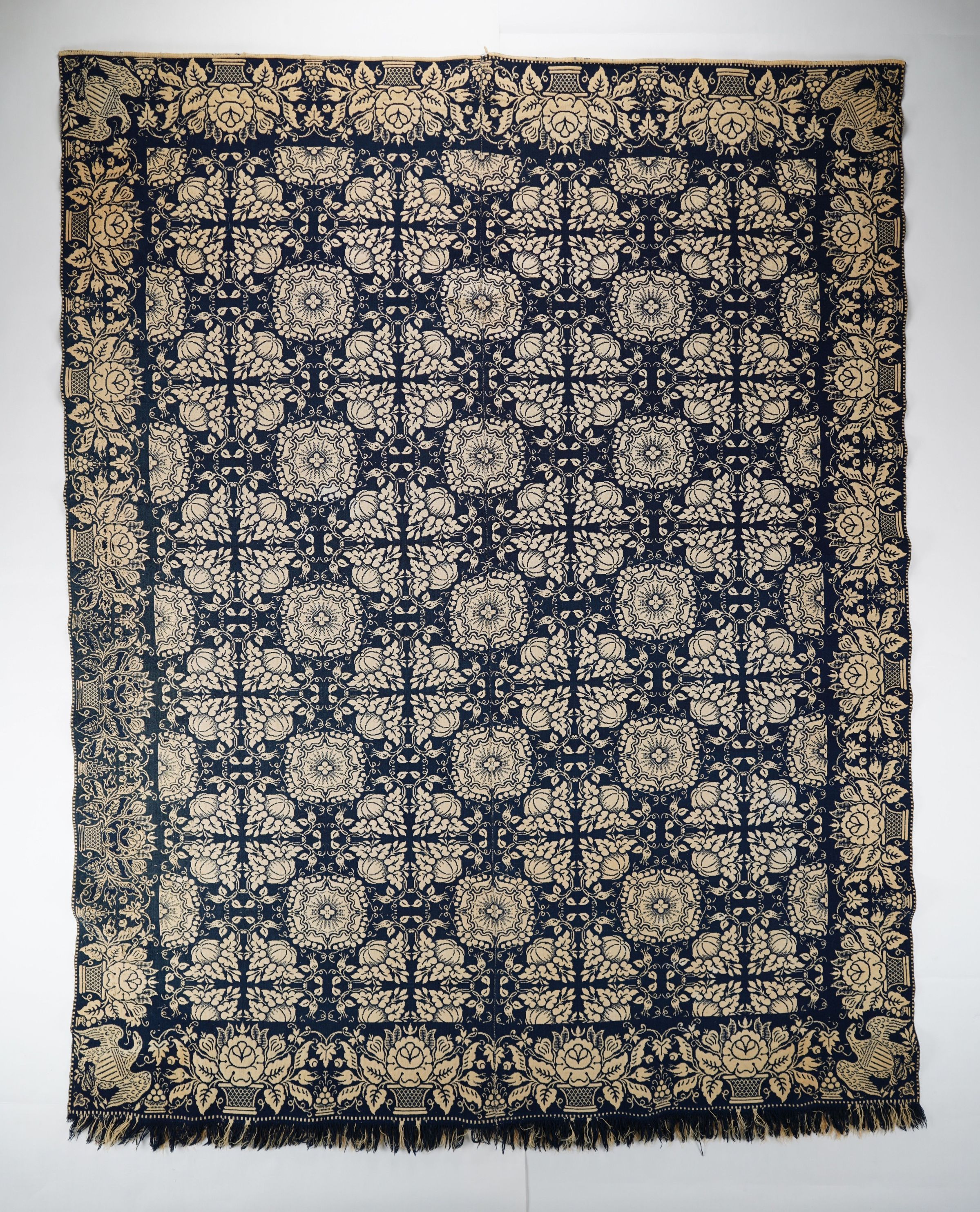 Navy and natural figured doubleweave coverlet; two panels joined by a center seam. Centerfield pattern of pumpkins surrounding abstract medallions. Flowerpot border on four sides with a shielded eagle trademark in all four corners attributed to Thomas Cranston.Collection