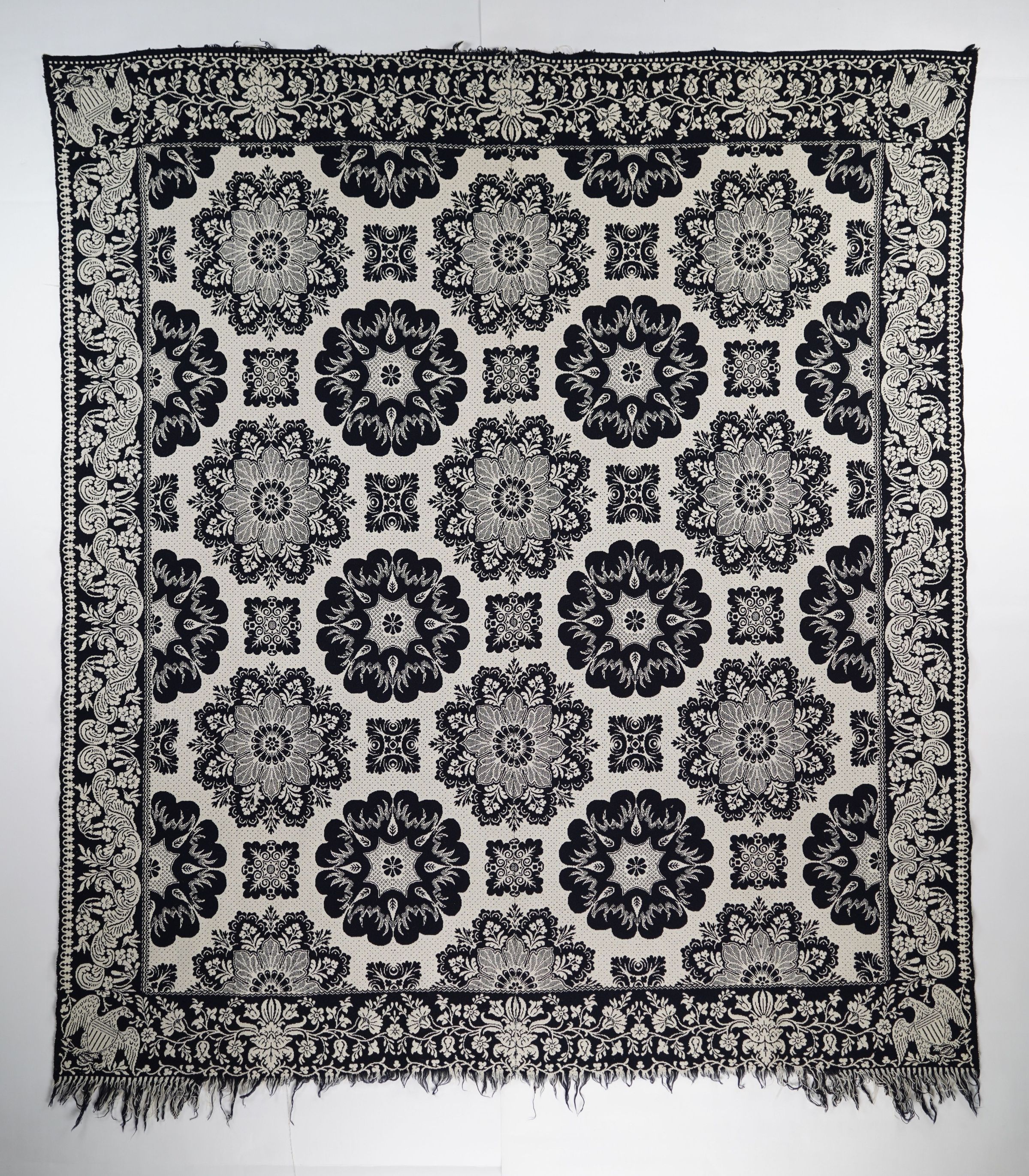 Navy and natural figured doubleweave coverlet; two panels joined by a center seam. Centerfield pattern of offset large and small medallions. Side borders of acanthus scrollwork with leaves and florals; top/bottom borders are a floral design (trumpet vine?) with hummingbirds, leaves and a scalloped design. Shielded eagle trademark in all four corners is attributed to Thomas Cranston.Collection