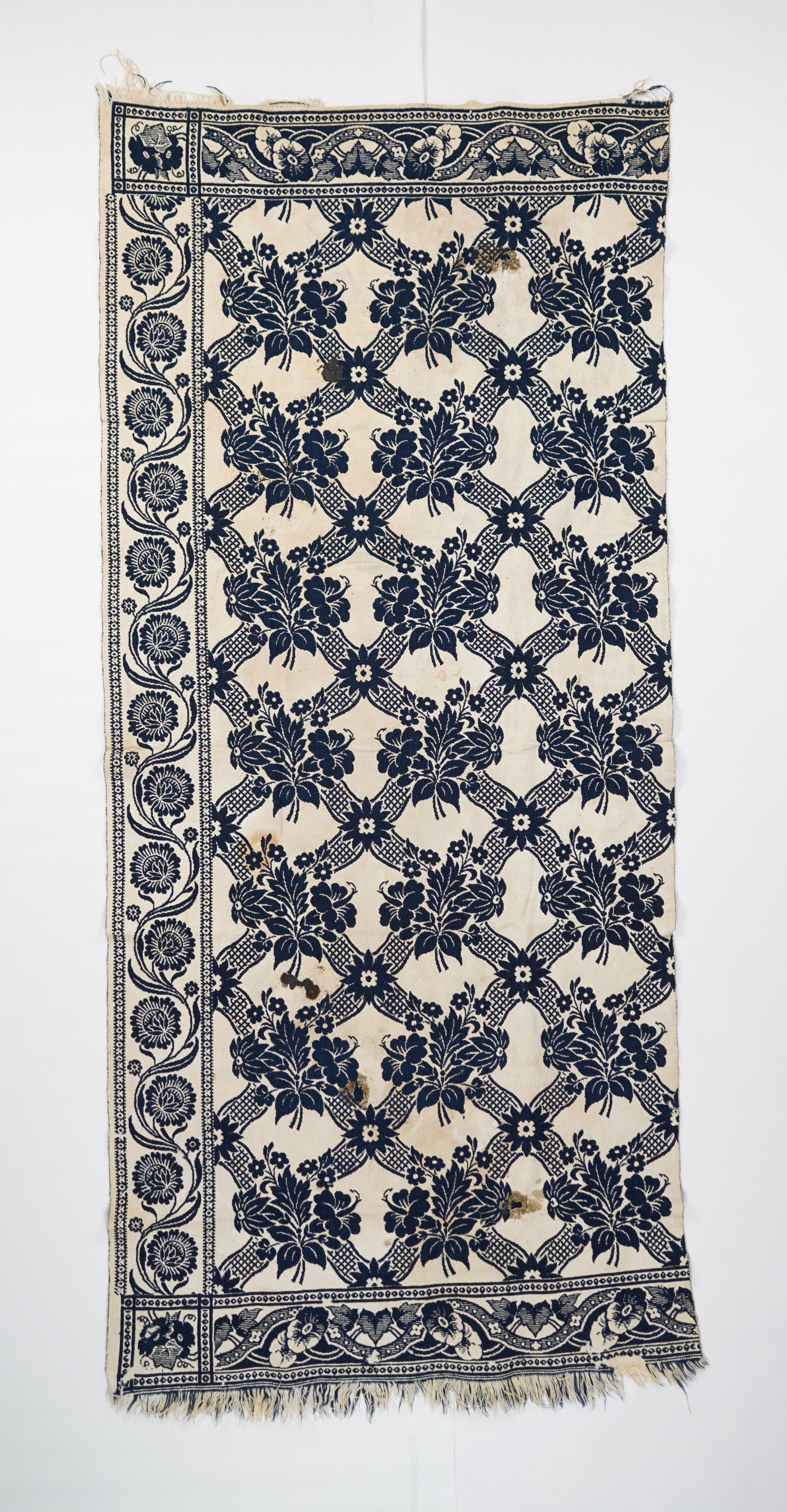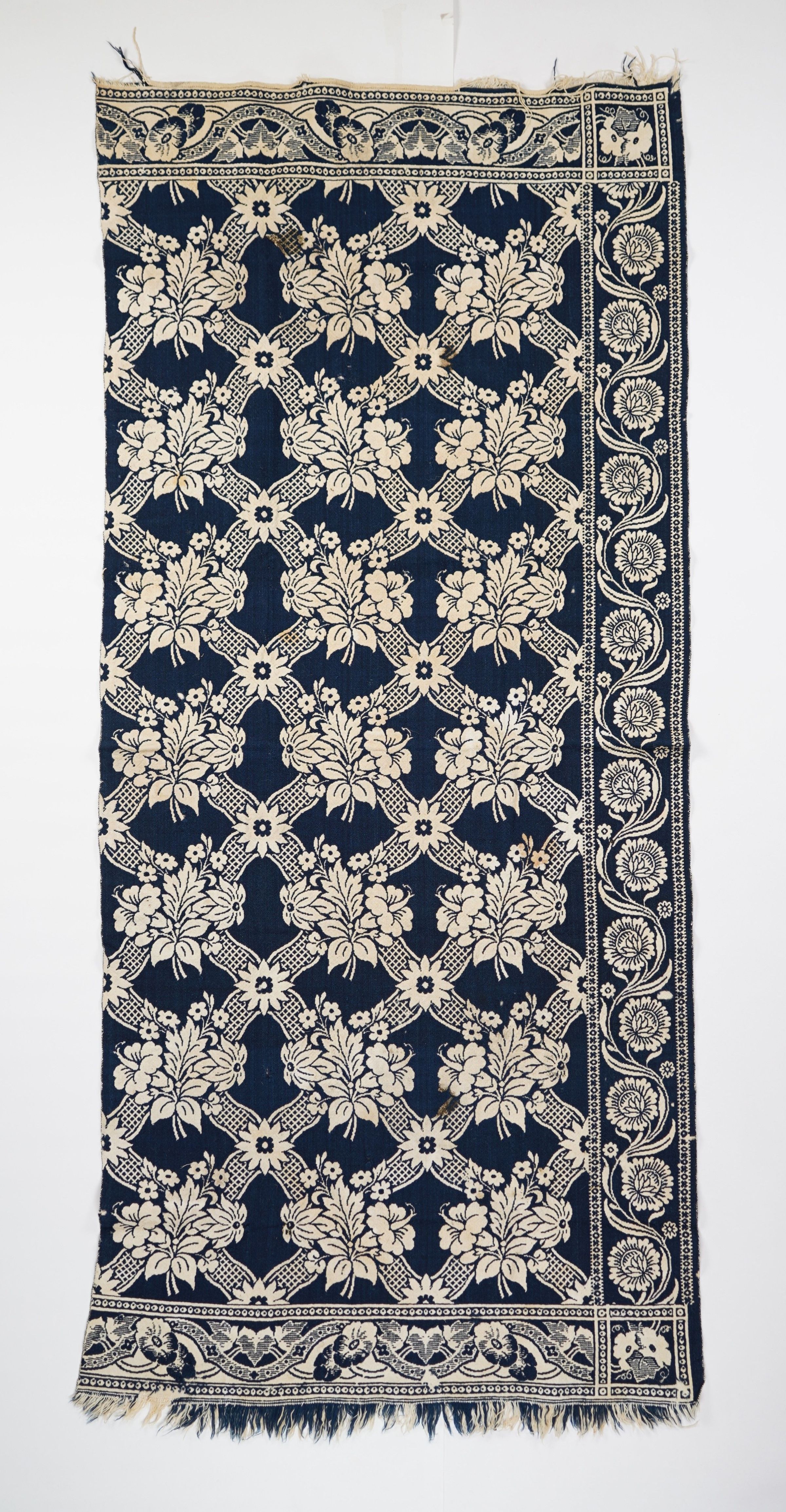 Navy and natural figured doubleweave coverlet with border on three sides and self fringe along top and bottom. One panel.Collection