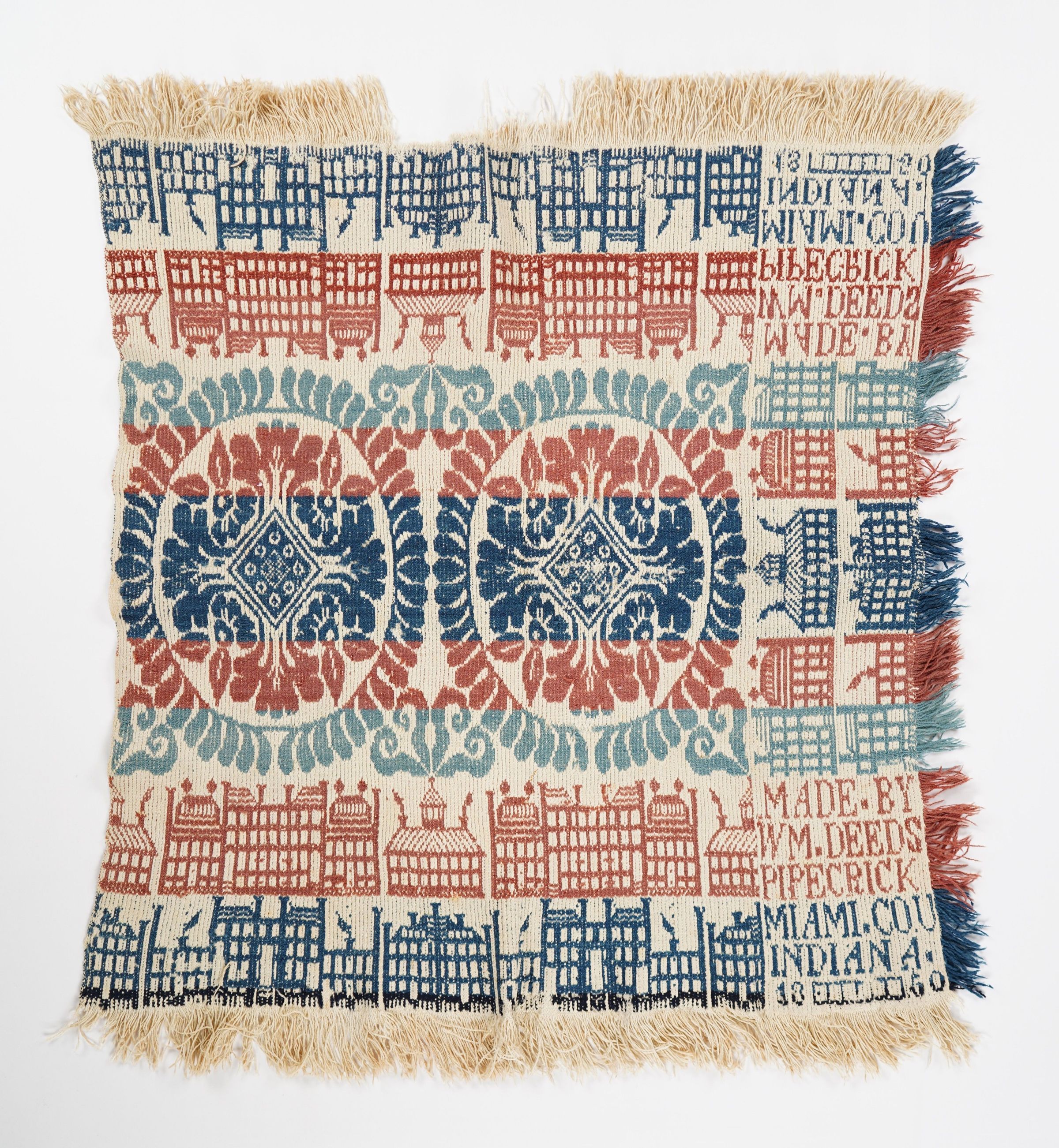 Figured and fancy tied beiderwand coverlet with borders on 3 sides and self-fringe on 3 sides. Woven full-width; seamless.Navy, red, and light blue wool with undyed cotton. Floral medallion centerfield pattern; building border on sides and bottom. Woven by William Deeds in 1850.Context