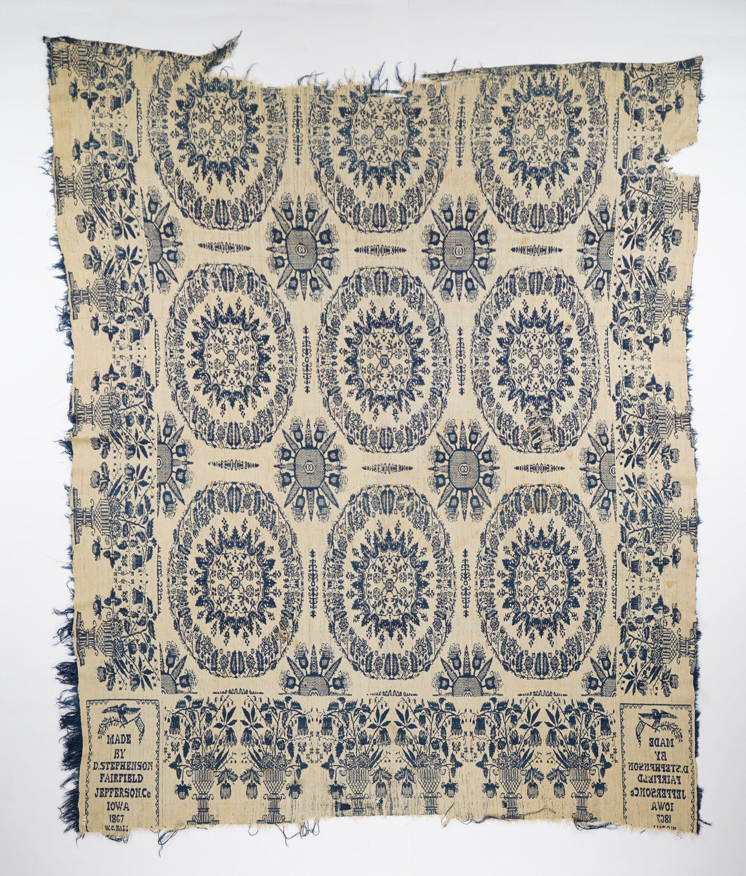 Navy and natural figured tied beiderwand coverlet with border on three sides and self-fringe on left sides. Woven for William Clay Ball by Daniel Stephenson in Fairfield, Jefferson Co., Iowa in 1867.Context