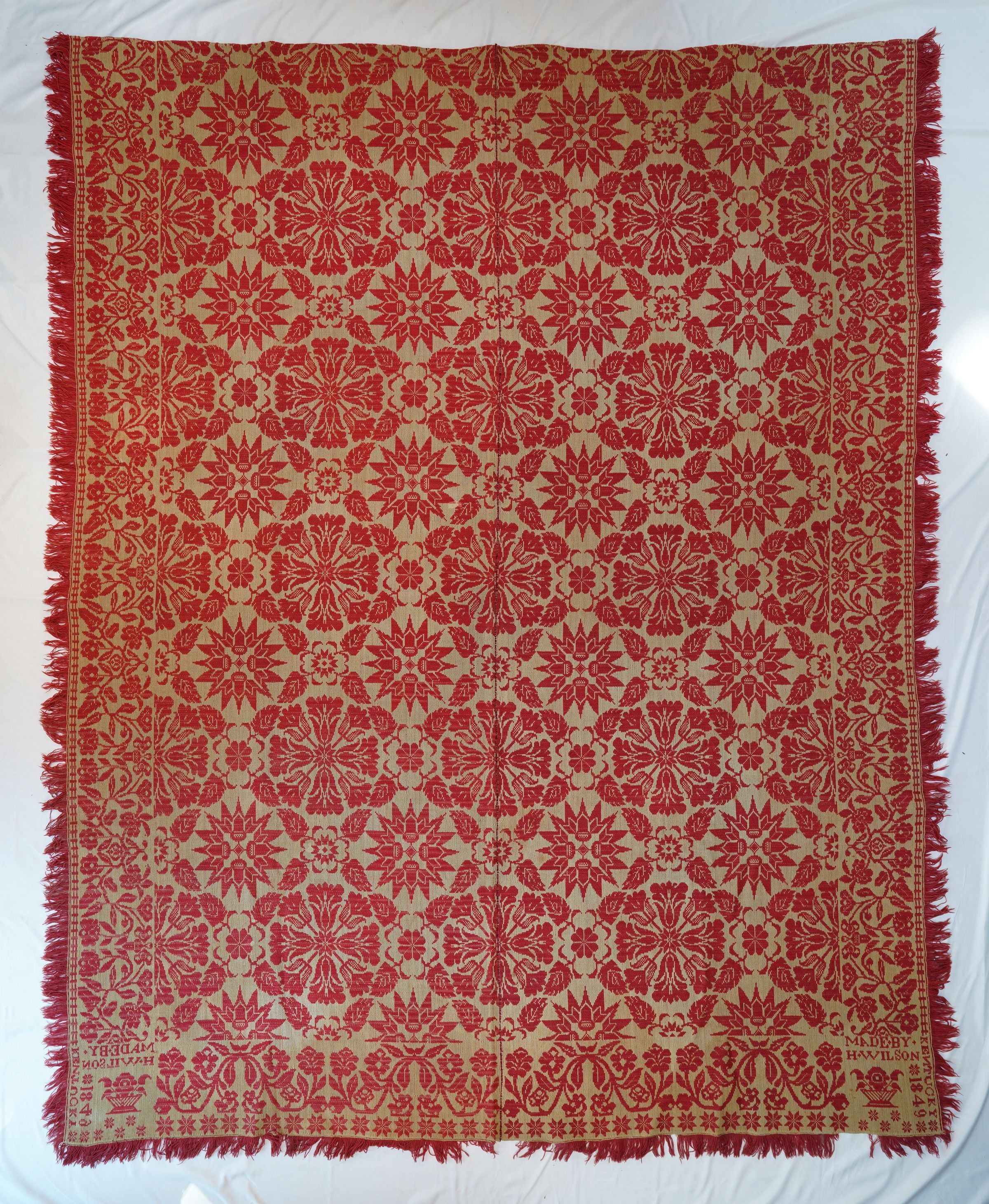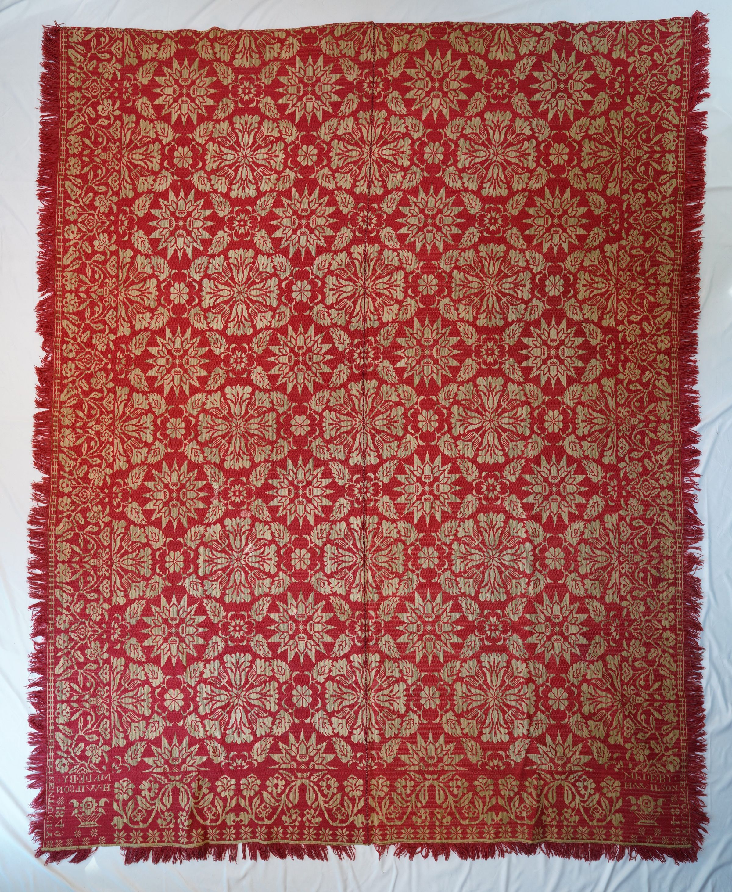 Red and natural figured Beiderwand coverlet; two panels joined. Tulip and acorn centerfield pattern with floral vine border and fringe on three sides.Collection