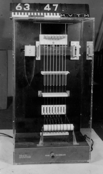 Model; jacquard mechanism. Model of the Jacquard mechanism for figured weaving. Motorized to demonstrate how a Jacquard card will trigger the individual heddles.Collection