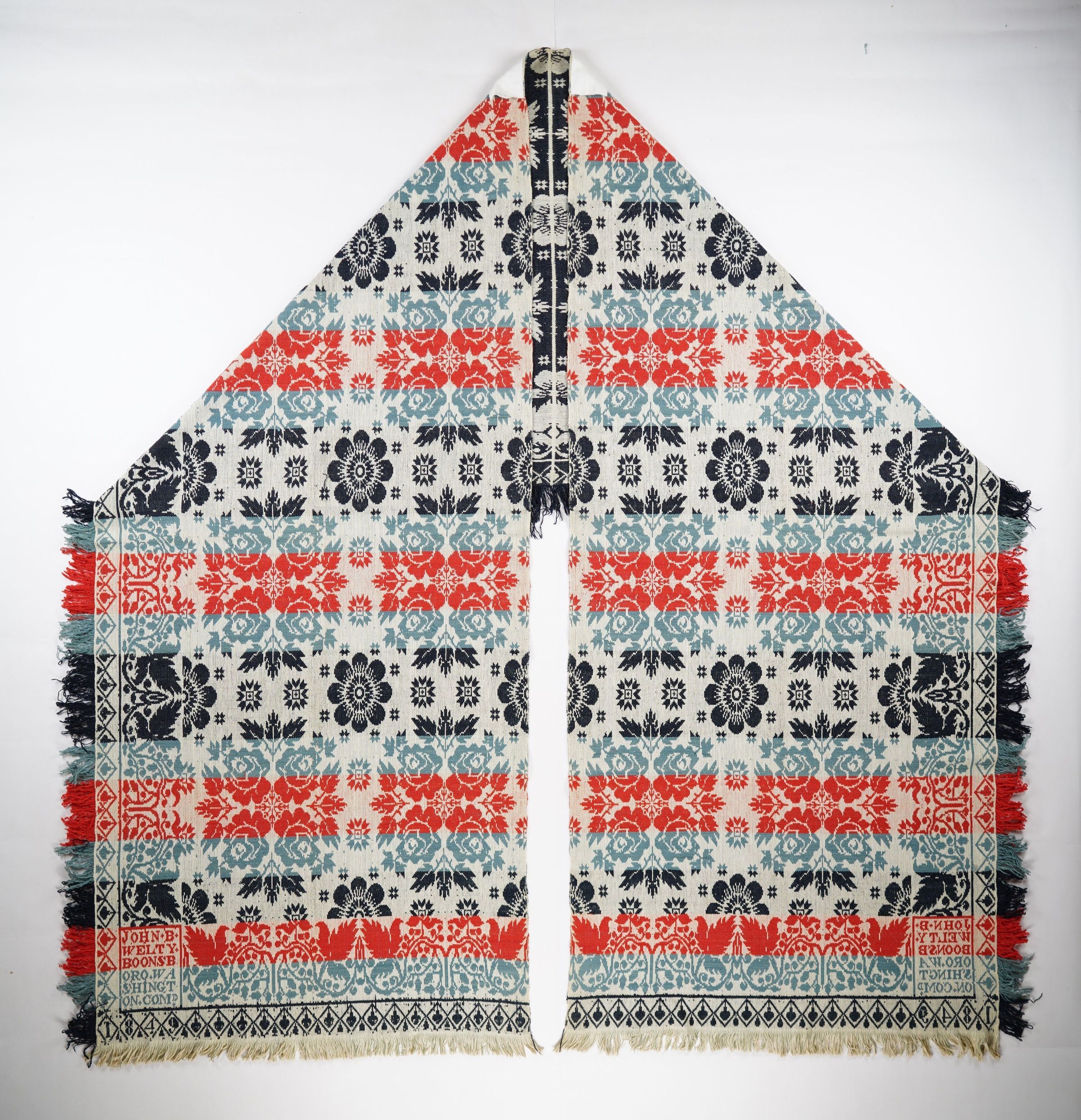 Figured and fancy tied beiderwand coverlet with borders on 3 sides and self-fringe on all sides. One piece containing two panels yet to be separated. Navy, light blue, and red wool with undyed cotton. Double rose centerfield pattern; Grapevine border on sides and bottom.