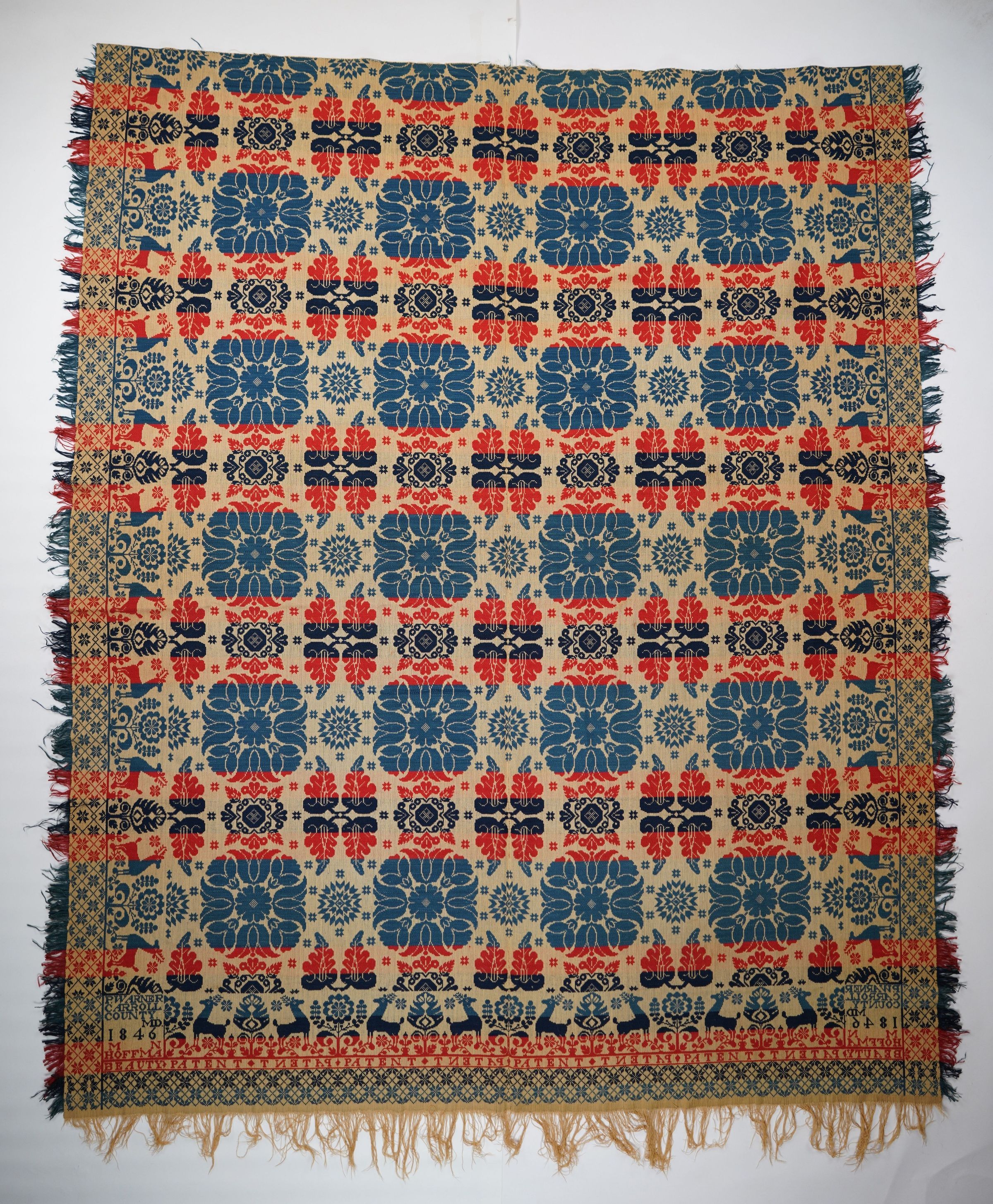 Red, blue, navy, and natural figured tied half doublecloth coverlet with border and self-fringe on three sides. Two joined panels. Woven for M. Hoffman by Peter Warner in Lineboro, Carroll County, Maryland in 1846.Collection