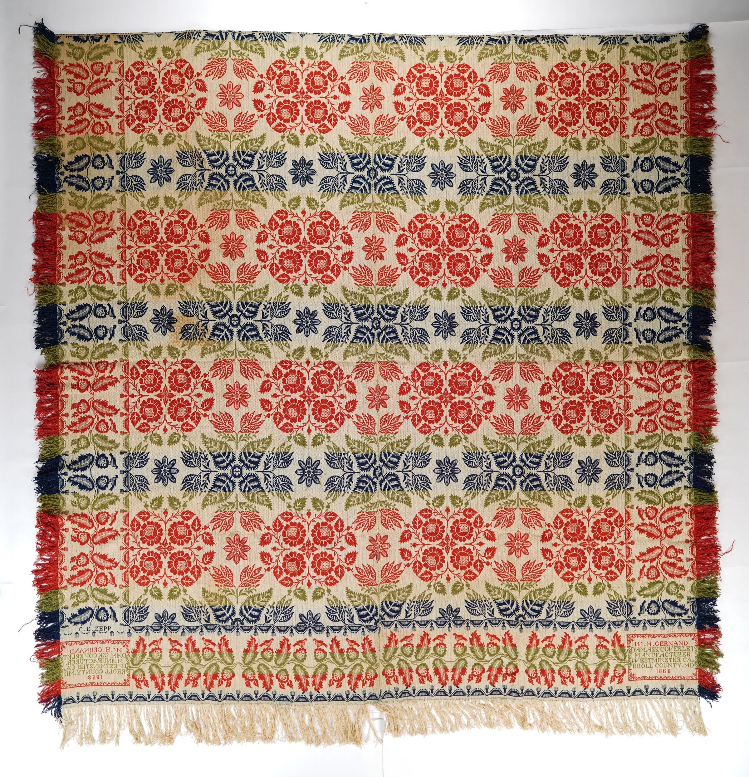C.E.ZEPP / W. H. GERNAND / DAMASK COVERLET / MANUFACTURER. / WESTMINSTER CA=/RROLL COUNTY. MD / 1868Material/Technique