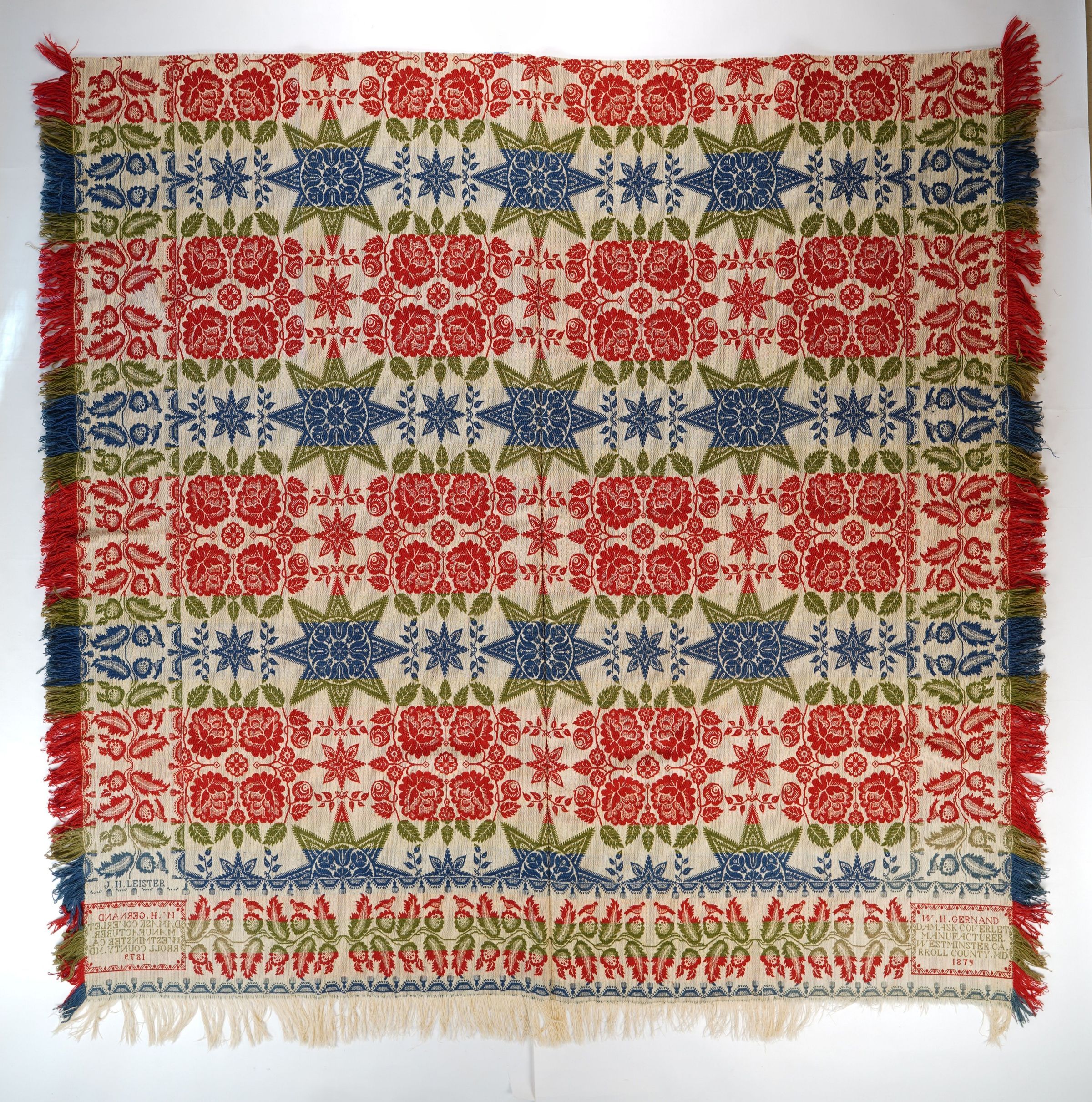 J. H. LEISTER / W. H. GERNAND / DAMASK COVERLET / MANUFACTURER. / WESTMINSTER CA=/RROLL COUNTY. MD / 1879Material/Technique