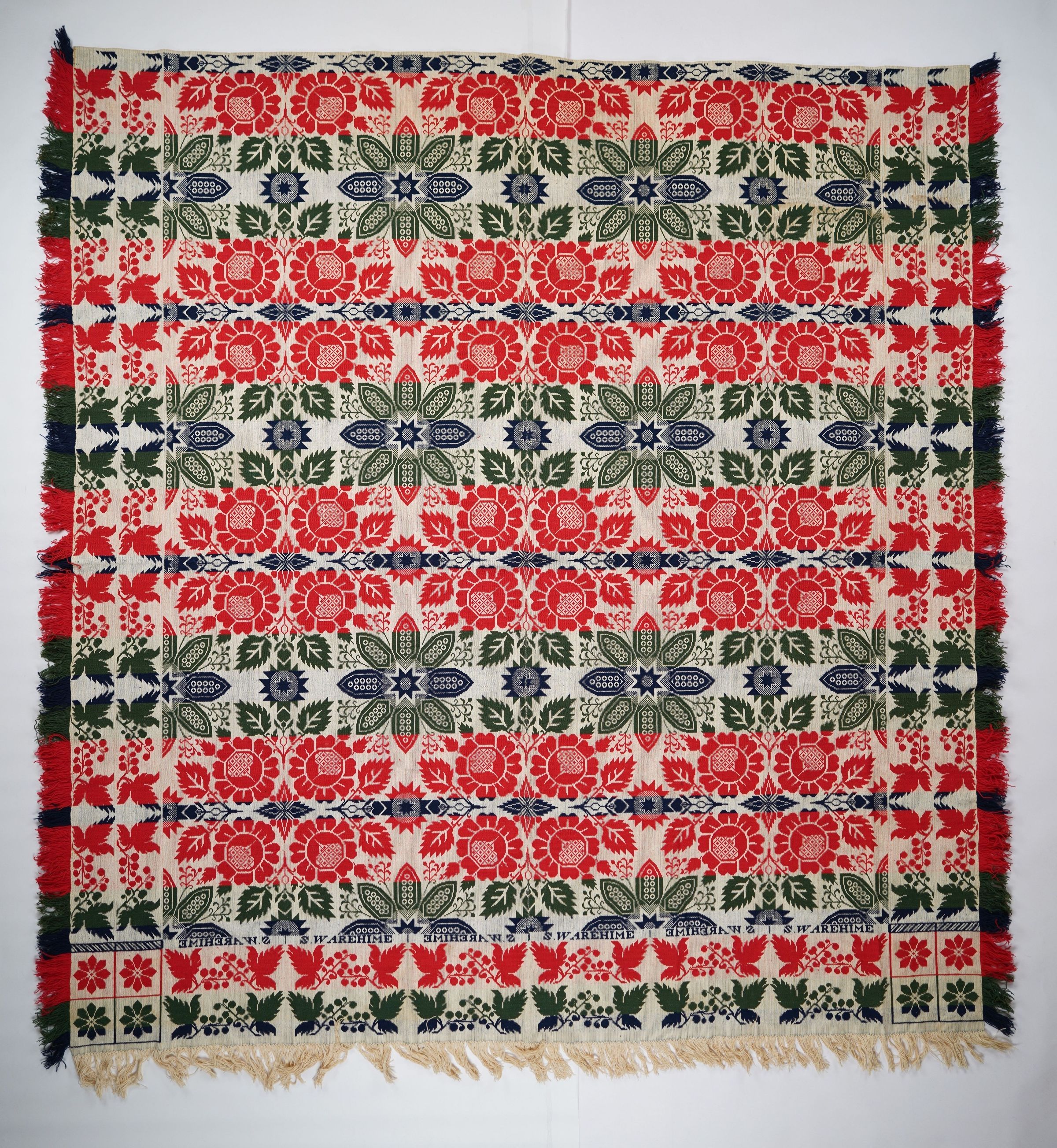 Red, green, navy, and natural figured tied half doublecloth coverlet with border and self-fringe on three sides. Seamless. Woven for S. Warehime in or near Pleasant Valley, Carroll Co., Maryland. Most contemporary instances of the surname Warehime appear in Carroll Co., MD, near the border with Pennsylvania.Collection