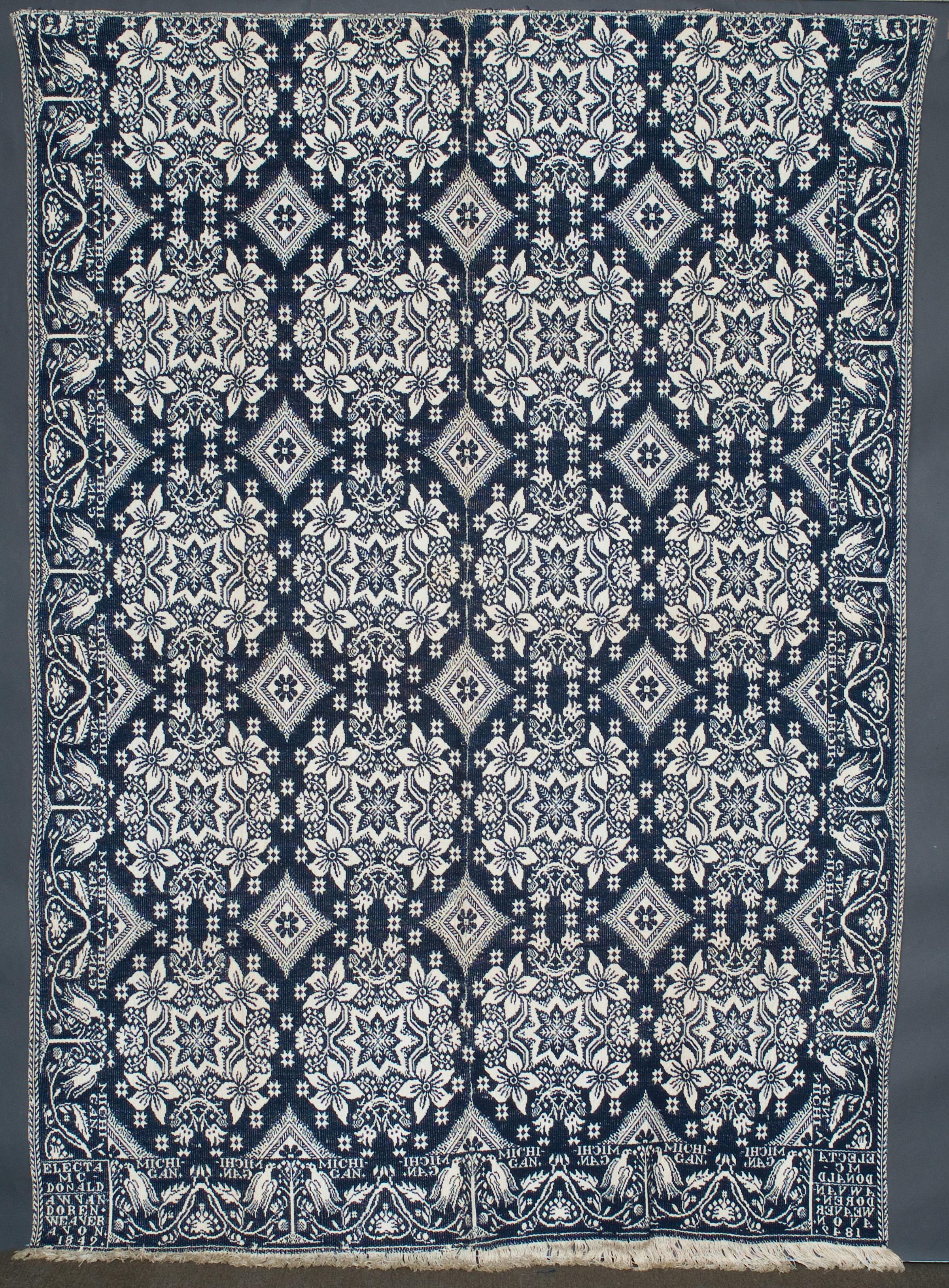 double weave; navy and natural; two loom widths joined; fringe on bottom; floral and star motif centerfield; repeating bird and tree border; the word michigan repeats on border; signature corner blocks in LL LRCollection