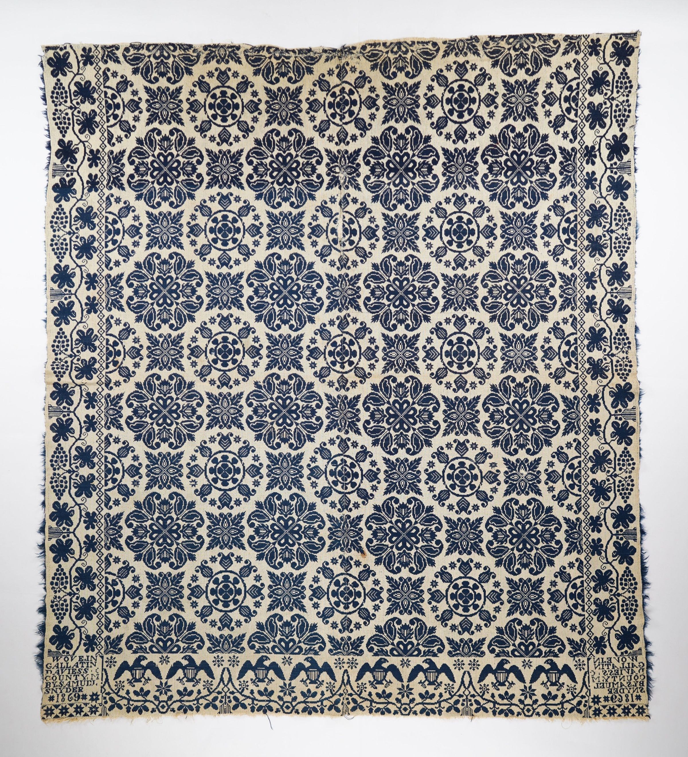 Figured and fancy tied beiderwand coverlet with borders on 3 sides and self-fringe on sides and bottom. Two panels joined by a center seam. Navy wool with undyed cotton. Medallion centerfield pattern; grapevine border on sides; eagle border on bottom. Woven by Samuel Snyder in 1869.Context