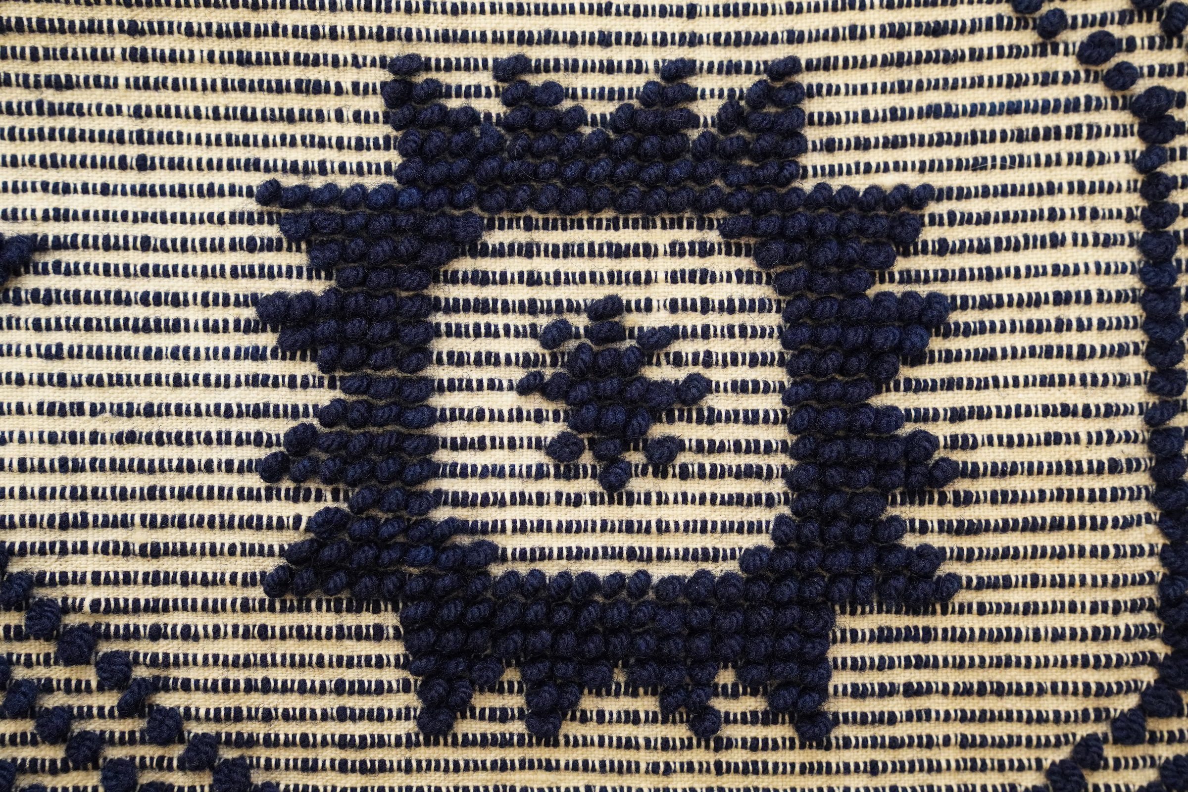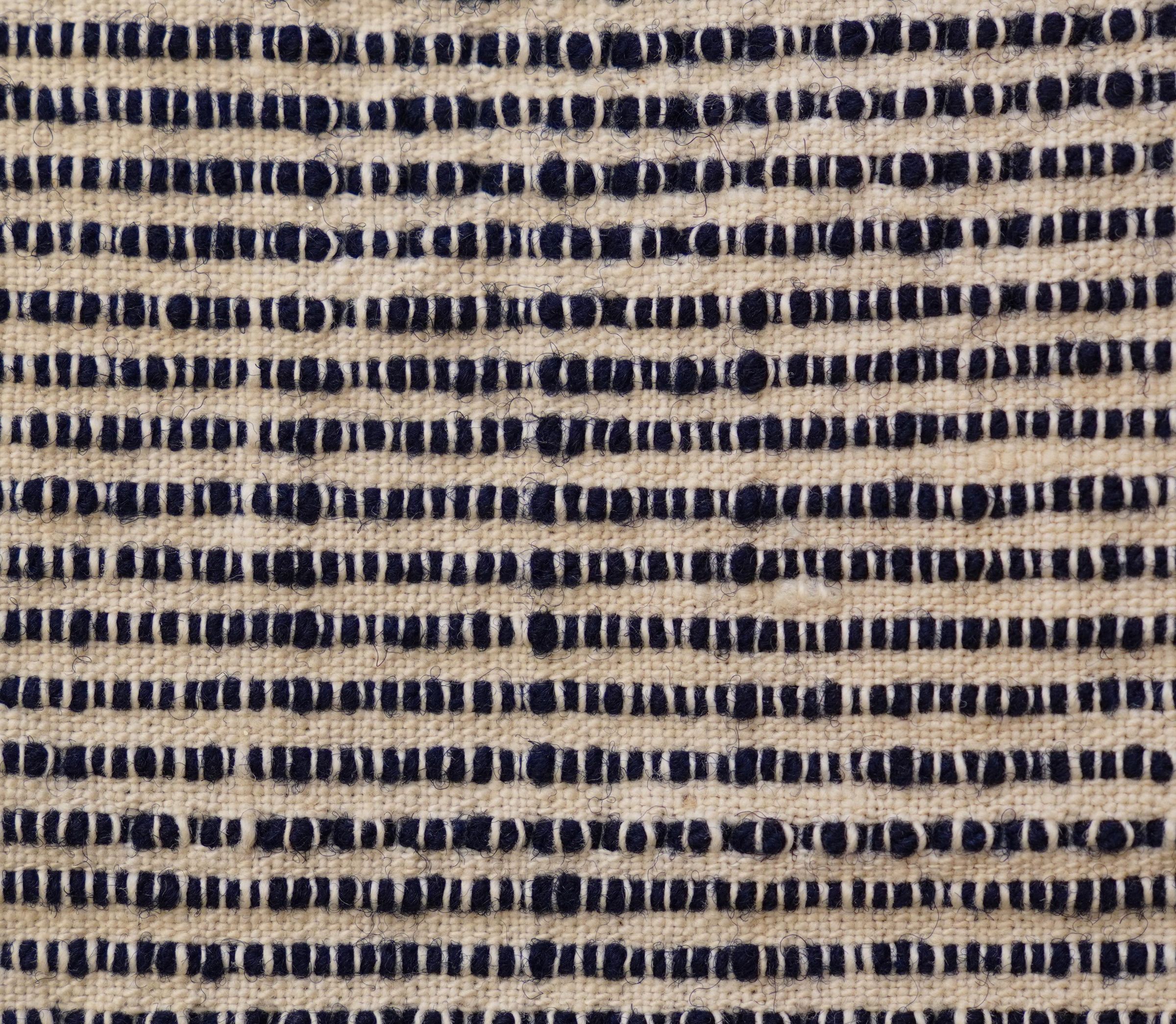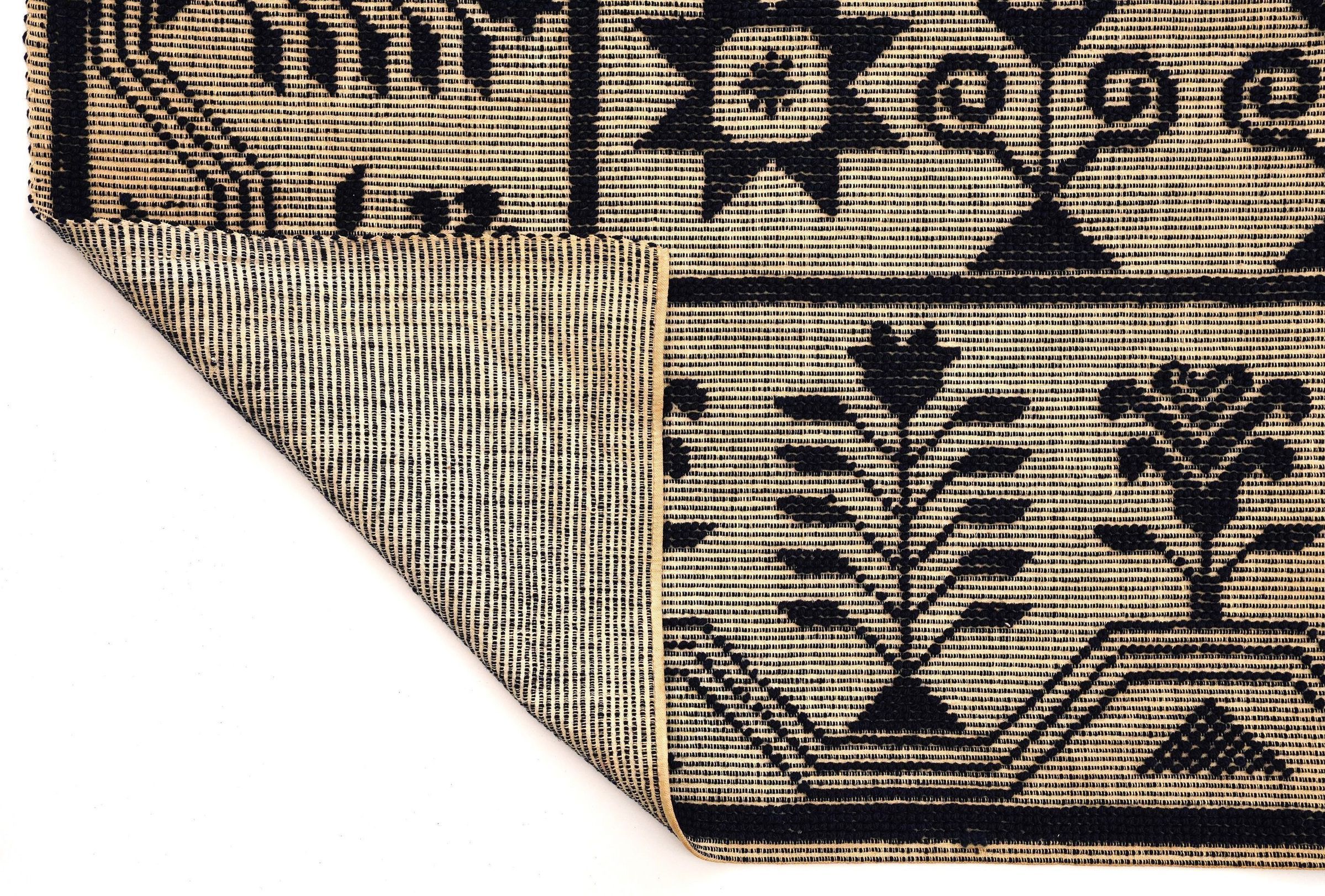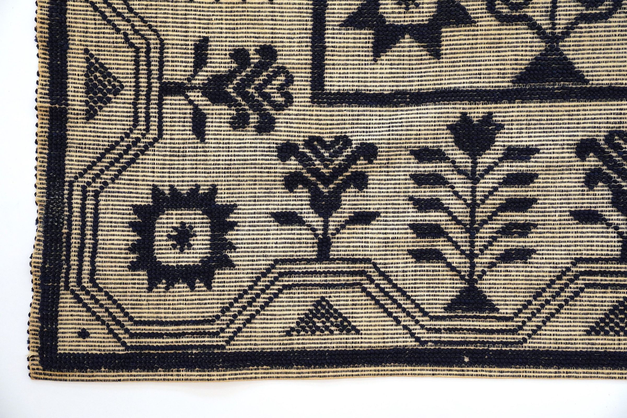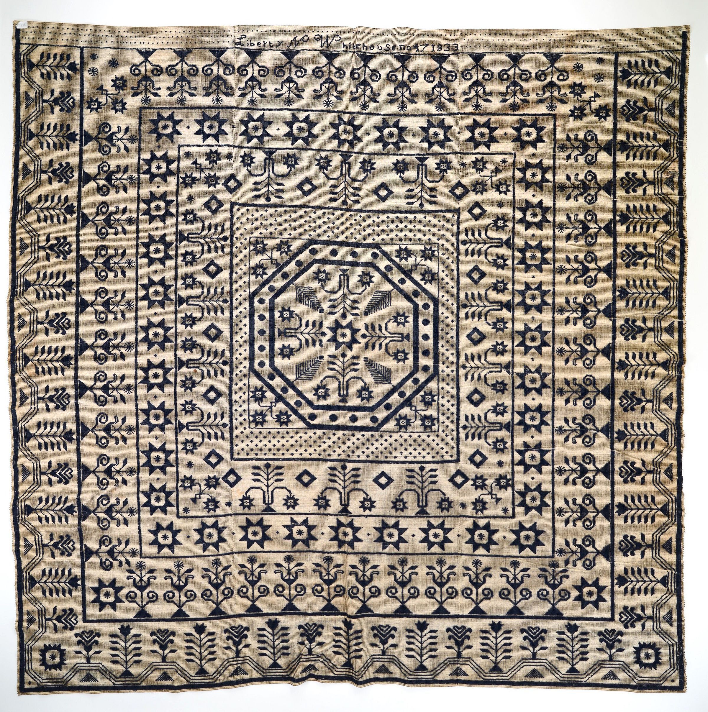 candlewick/weft loop weave; navy and natural; 3 loom widths joined; 2 seams; no corner blocks; no fringe; flowers on 2 outermost borders; outermost border is only on 3 sides (not on the one with the inscription); center medallion has pattern of trees and flowersCollection