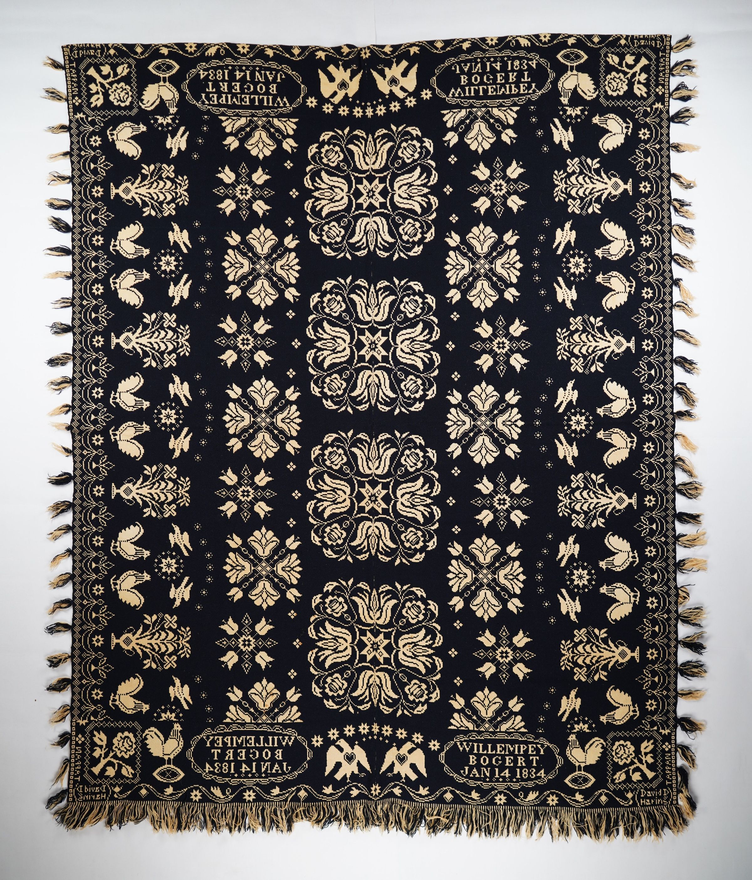 Figured and fancy doubleweave coverlet with borders on 4 sides and self-fringe on sides and bottom. Two panels joined by a center seam. Navy wool with undyed cotton. Floral centerfield pattern; Bird and urn border on sides; eagle and floral border on bottom and top. Woven by David Haring for Willempey Bogert in 1834.Context