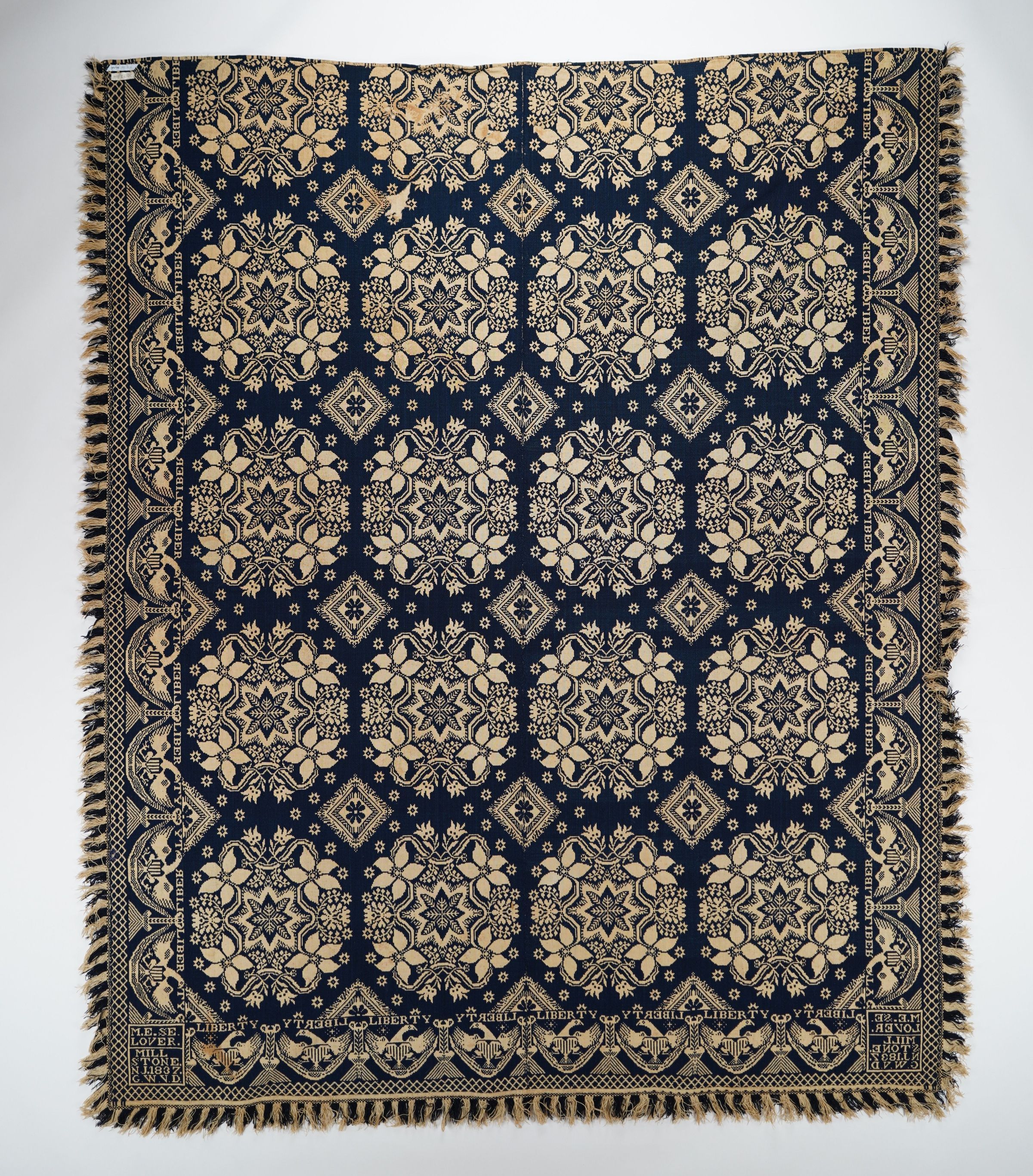 Figured coverlet; undyed cotton and blue wool, double cloth. Center seam joins two panels. Hemmed top, fringed bottom and sides. Central motif consists of medallions of four lilies surrounding a starburst. Small stars outline the medallions. The medallions are separated from one another by a diamond shaped motif that has a flower on the center. Borders have a tassel and swag motif with eagles. The eagles are carrying a shield on their chests and are located above the swag. Secondary borders on three sides contain a diamond lattice pattern.Collection
