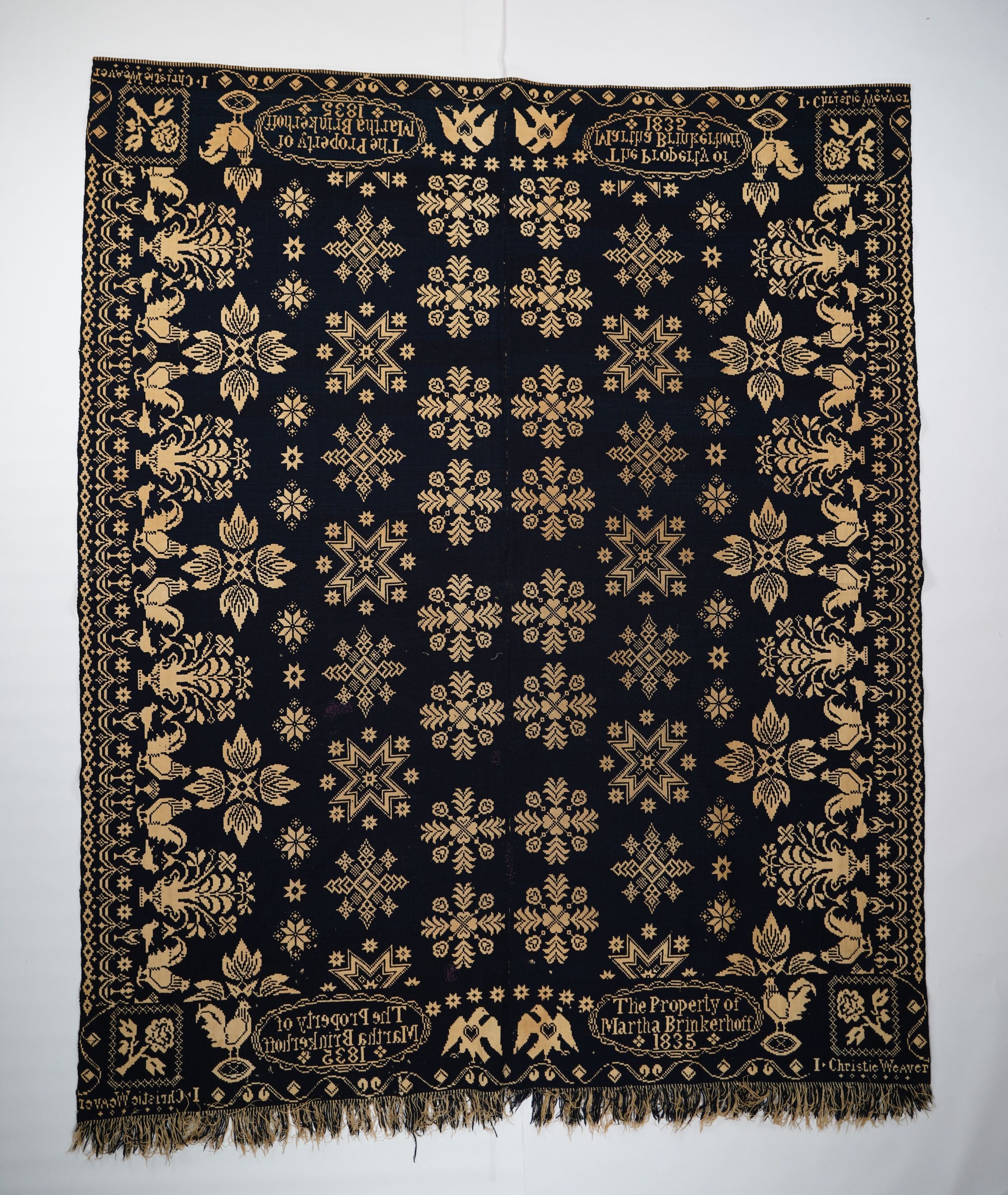 Navy and natural figured doublecloth coverlet with border on four sides and self-fringe along bottom. Two joined panels. Woven by I. Christie for Martha Brinkerhoff in Bergen Co., New Jersey in 1835.Collection