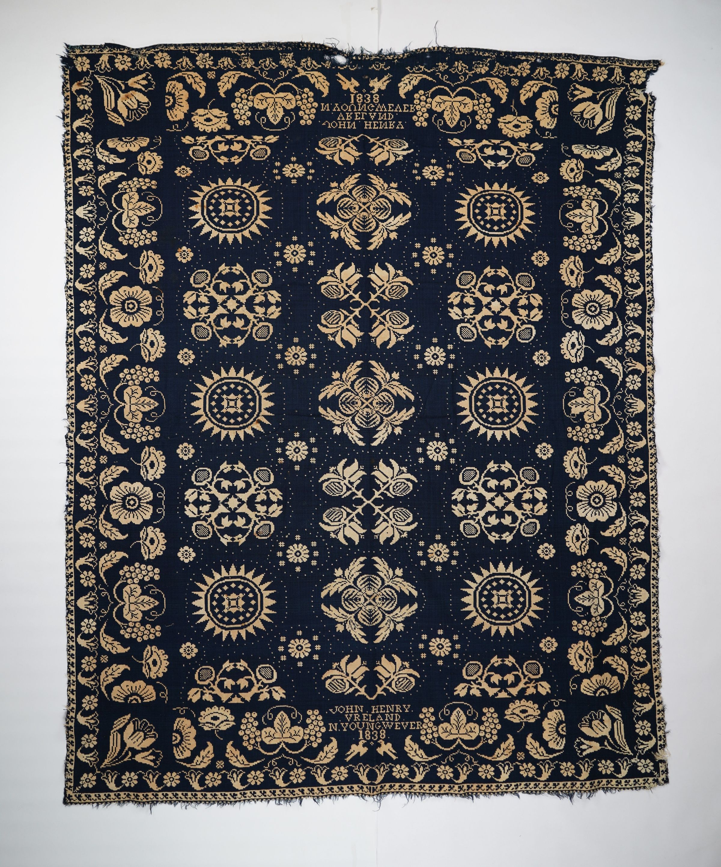 Navy and natural figured double weave coverlet with border on four sides. Woven for John Henry Vreland by Nicholas Young in 1838.Collection