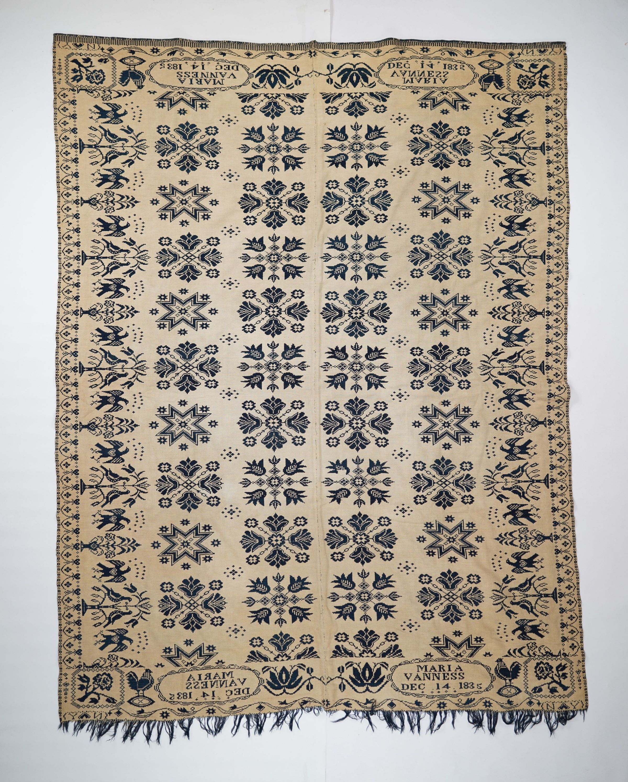 Navy and natural figured double weave coverlet with border on four sides and self-fringe along bottom. Two joined panels. Woven for Maria Vanness around December 14, 1835.Collection