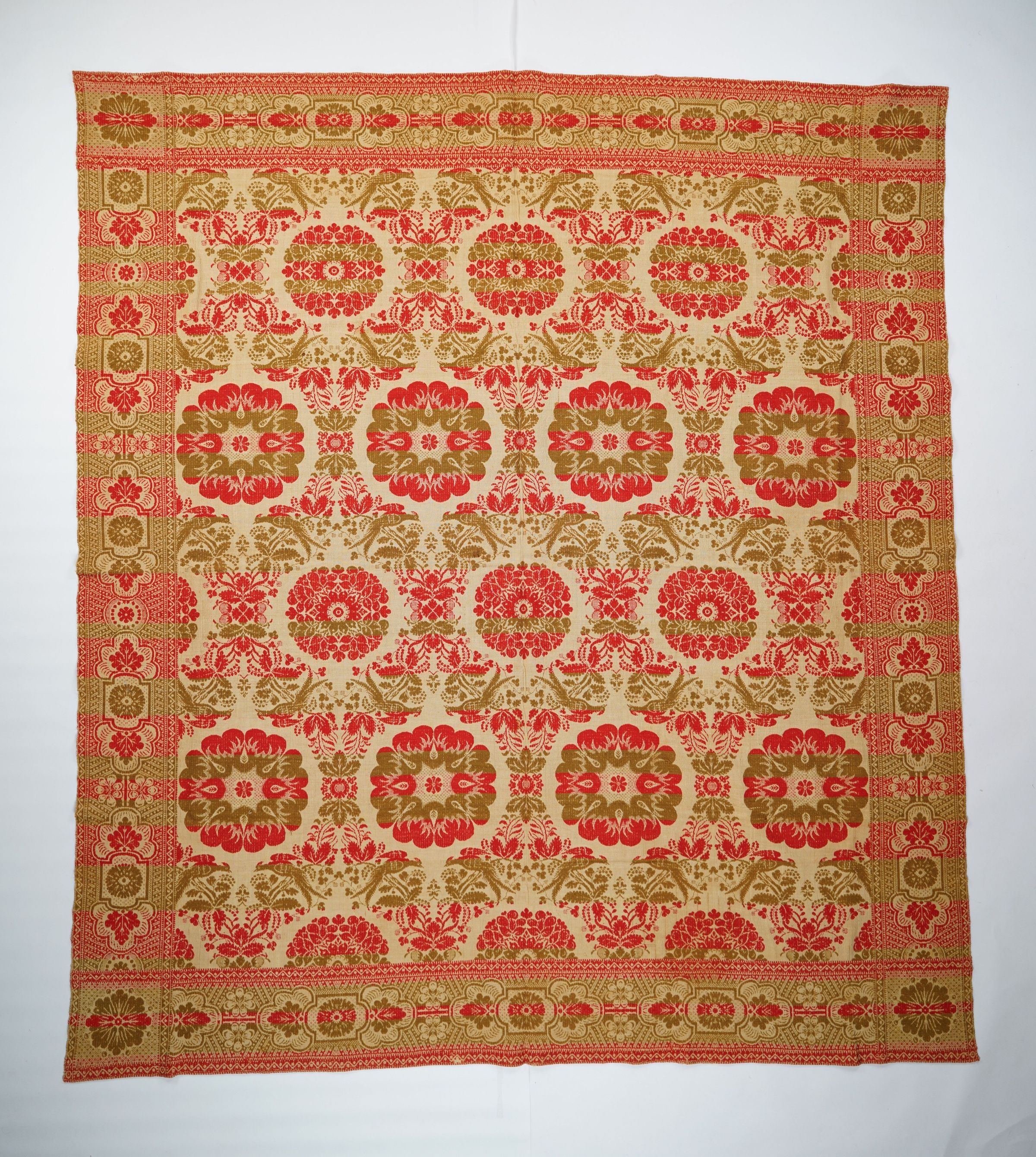Red, yellow, and natural figured true beiderwand coverlet with border on four sides. Seamless.Collection