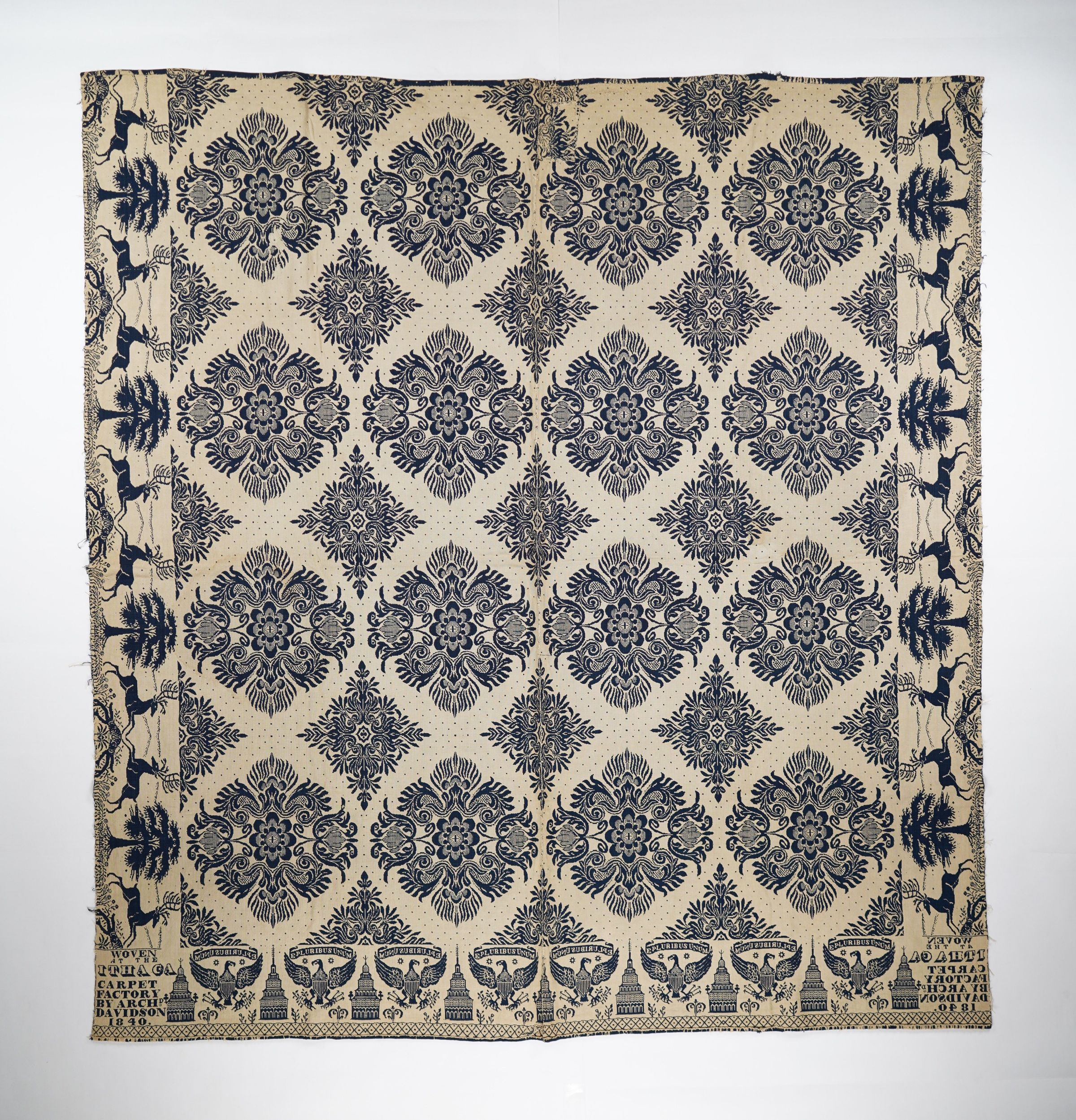 Figured doubleweave coverlet with borders on three sides and no fringe. Two panels joined by a center seam. Navy wool with undyed cotton. Tulip medallion centerfield pattern; deer and trees border on sides; patriotic eagle border on bottom. Woven by Archibald Davidson in 1840.Context