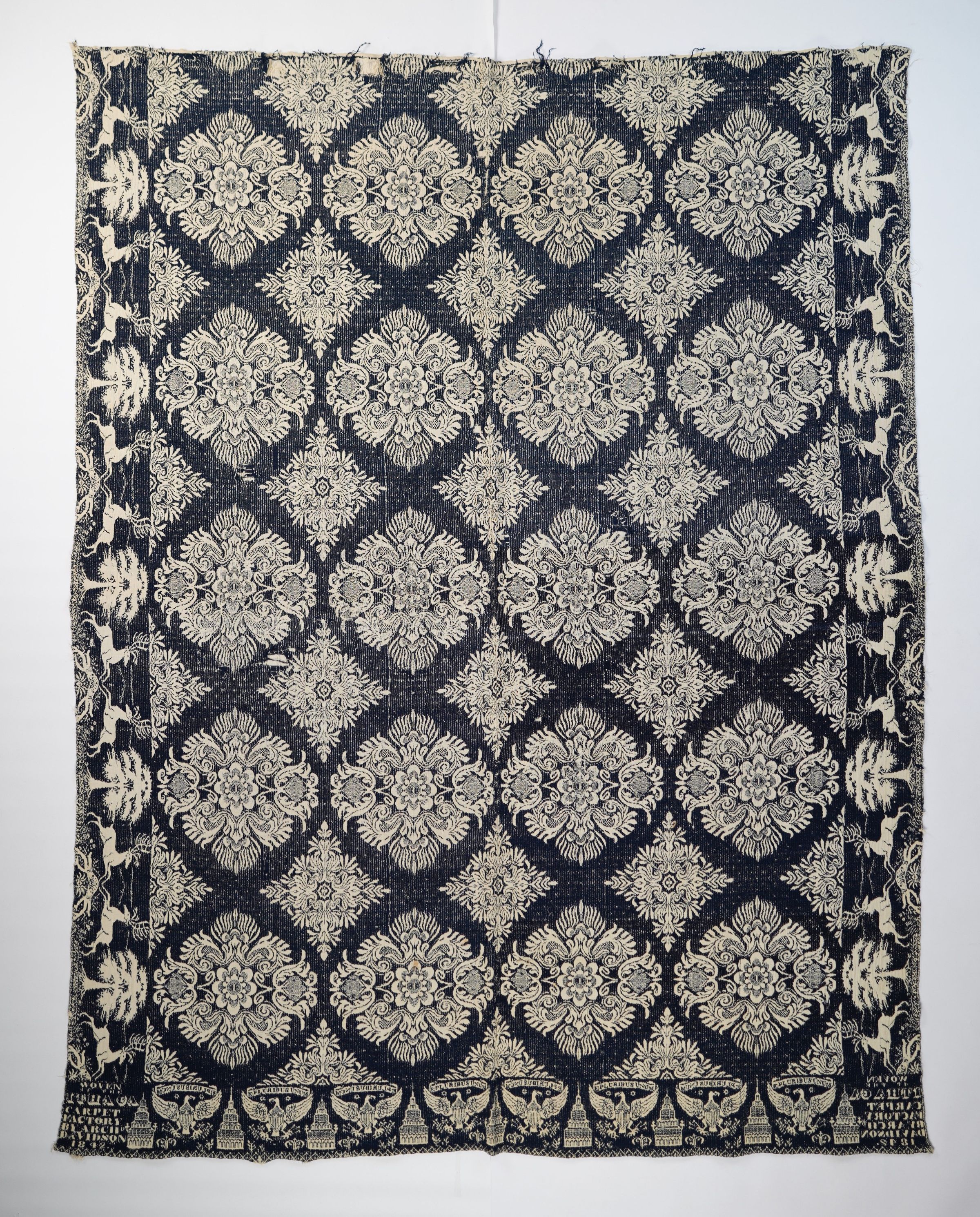 Navy and natural figured tied beiderwand coverlet with border on three sides. Two joined panels. Bottom border features federal eagle with "E PLURIBUS UNUM" and left and right borders feature deer with tree. Woven by Archibald Davidson at the Ithaca Carpet Factory in Ithaca, Tompkins Co., New York in 1842.Collection