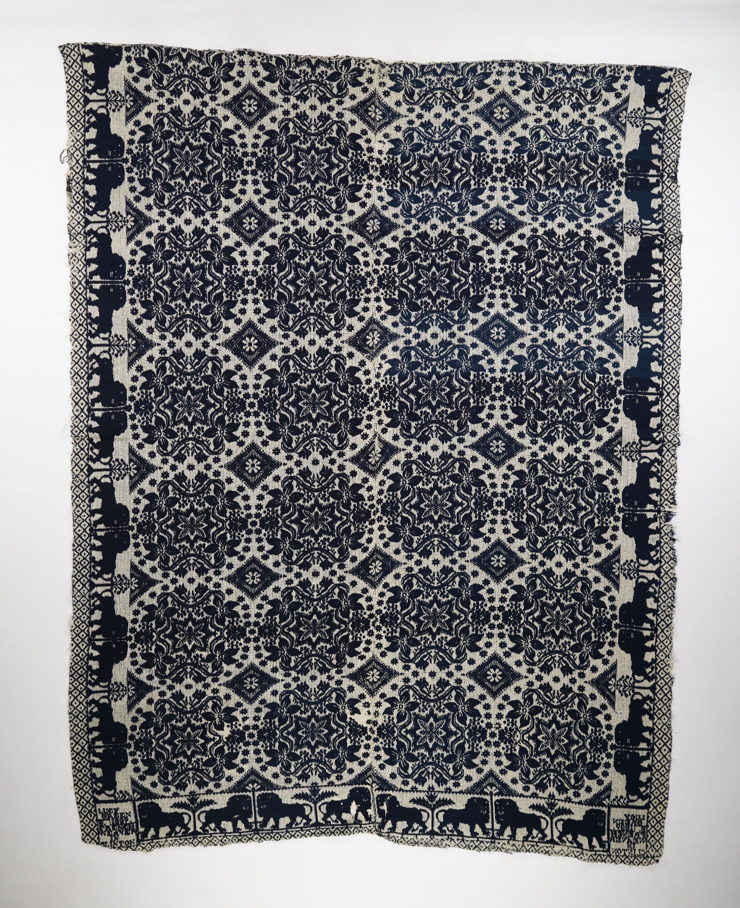 Figured and fancy tied beiderwand coverlet with borders on 3 sides and no fringe. Two panels joined by a center seam. Navy wool with undyed cotton. Lilies of France centerfield pattern; lion border on sides and bottom. Woven by Bartlett French for Lucy Green in 1839.Context