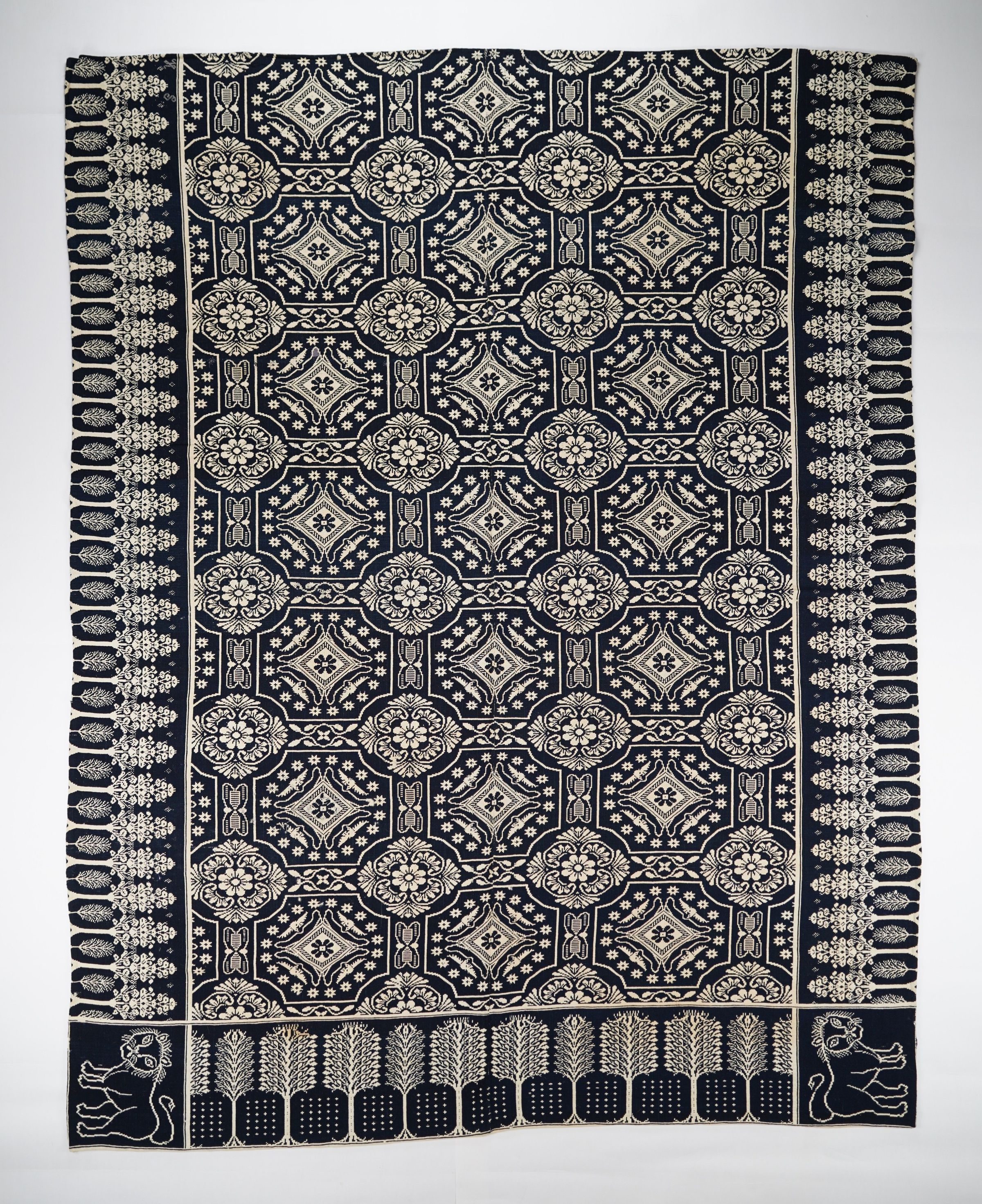 Navy and natural figured doubleweave coverlet with border on three sides. Two joined panels. Attributed to Benjamin June in New York, based on the lion cornerblock.Context