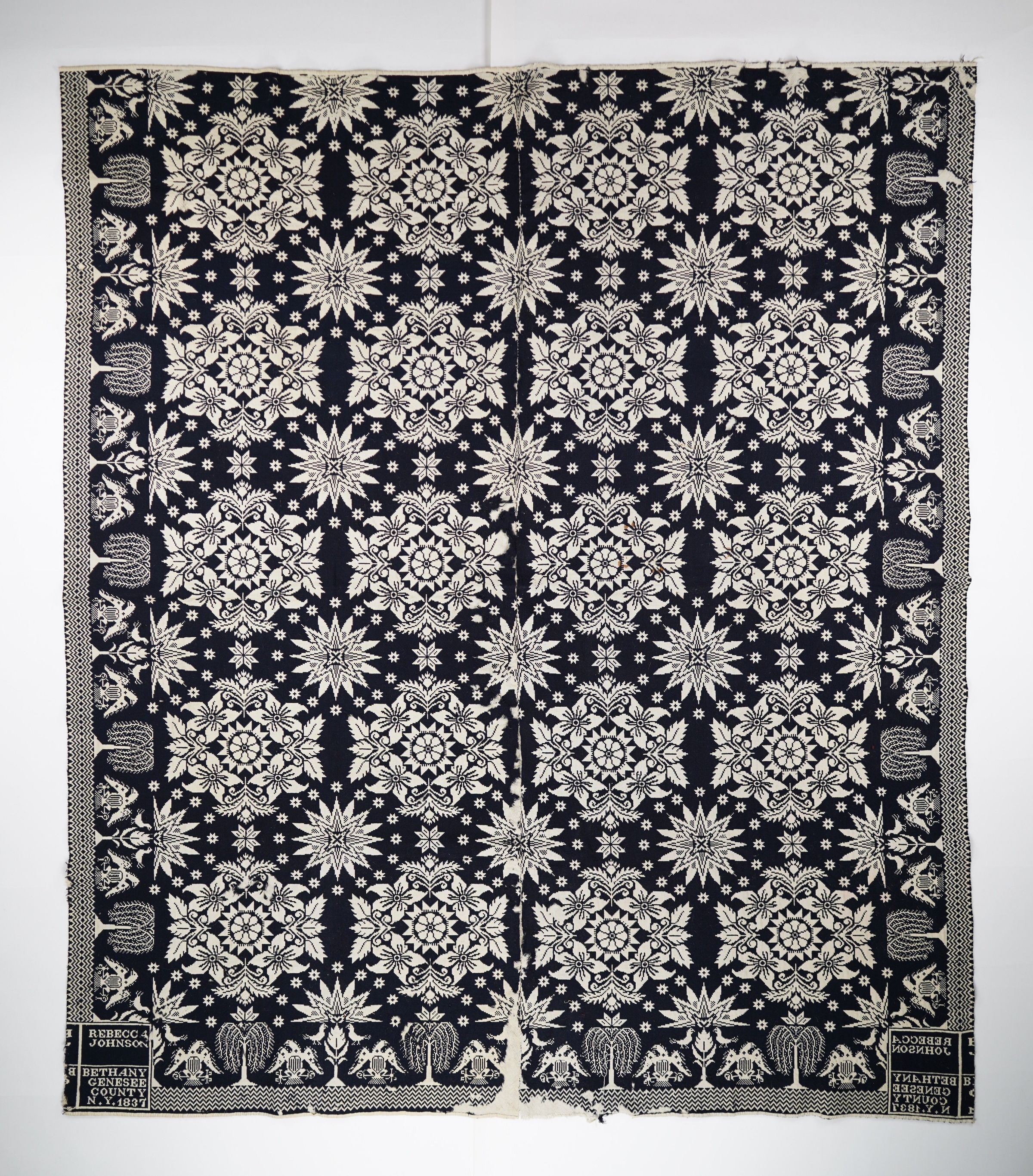 Figured and fancy doubleweave coverlet with borders on 3 sides and no fringe. Two panels joined by a center seam. Navy wool with undyed cotton. Lilies of France centerfield pattern; eagle and willow tree border on sides and bottom. Woven for Rebecca Johnson in 1837 and attributed to S. Humphreys.Context