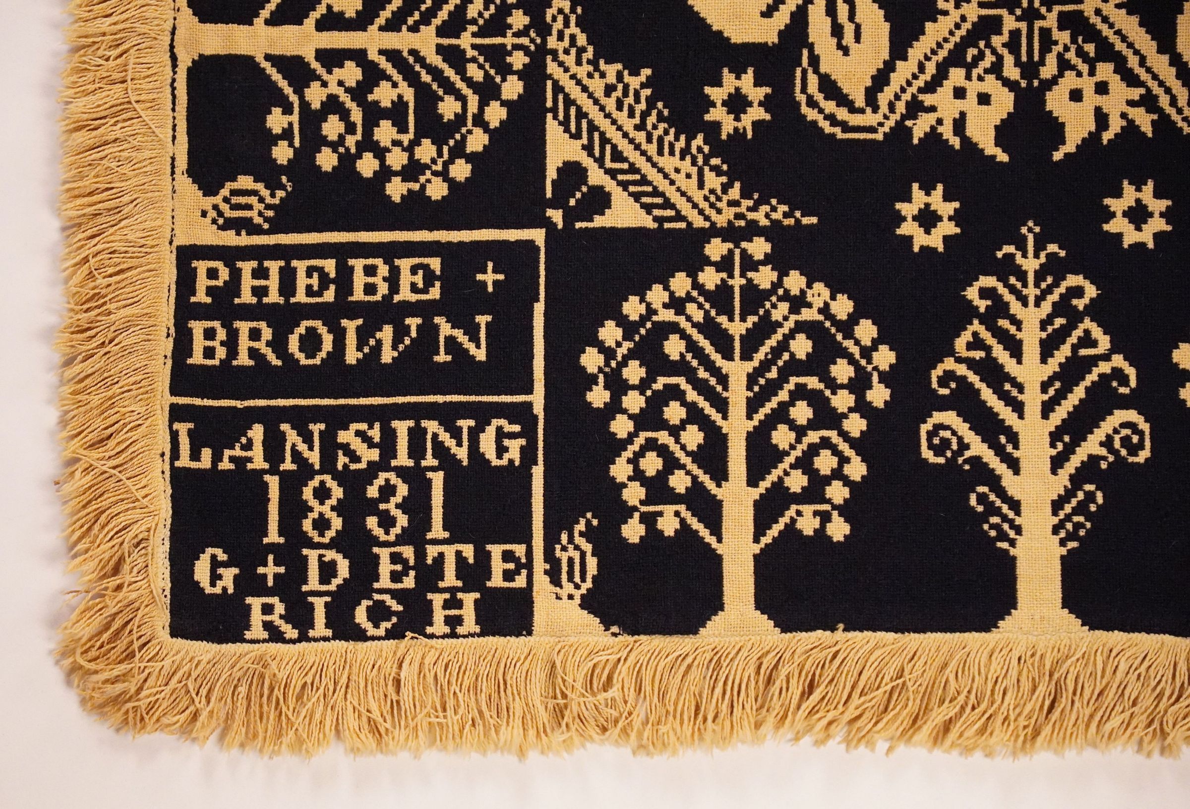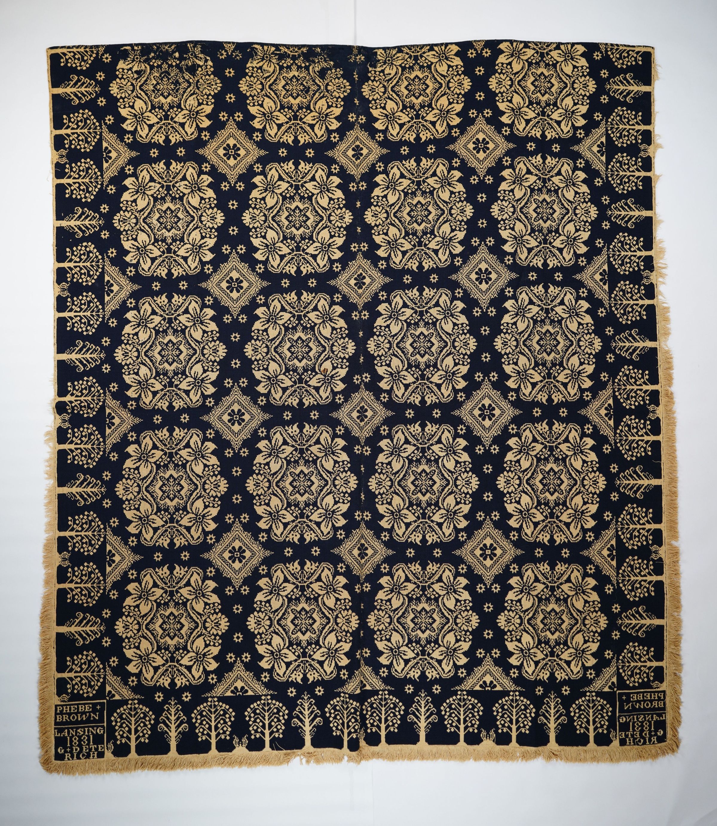 Navy and natural figured doublecloth coverlet with border and fringe on three sides. Two joined panels. Woven for Phebe Brown by George Deterich in Lansing, Tompkins Co., New York in 1831.Collection
