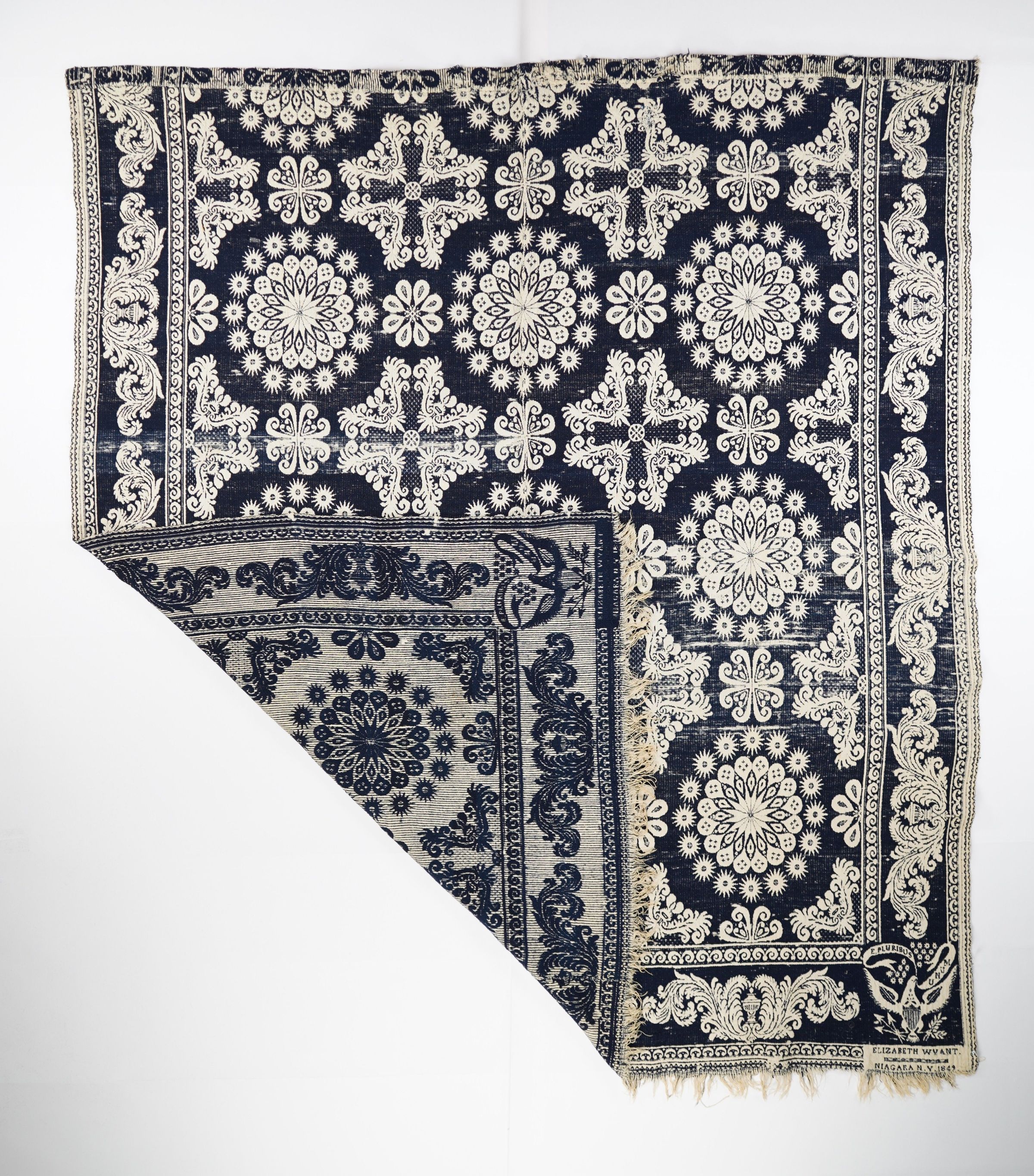 Figured and fancy tied beiderwand coverlet with borders on 3 sides and self-fringe on bottom. Two panels joined by a center seam. Navy wool with undyed cotton. Floral centerfield pattern; leafy border on sides and bottom. Attributed to Harry Tyler, woven for Elizabeth Wyant in 1849.Context