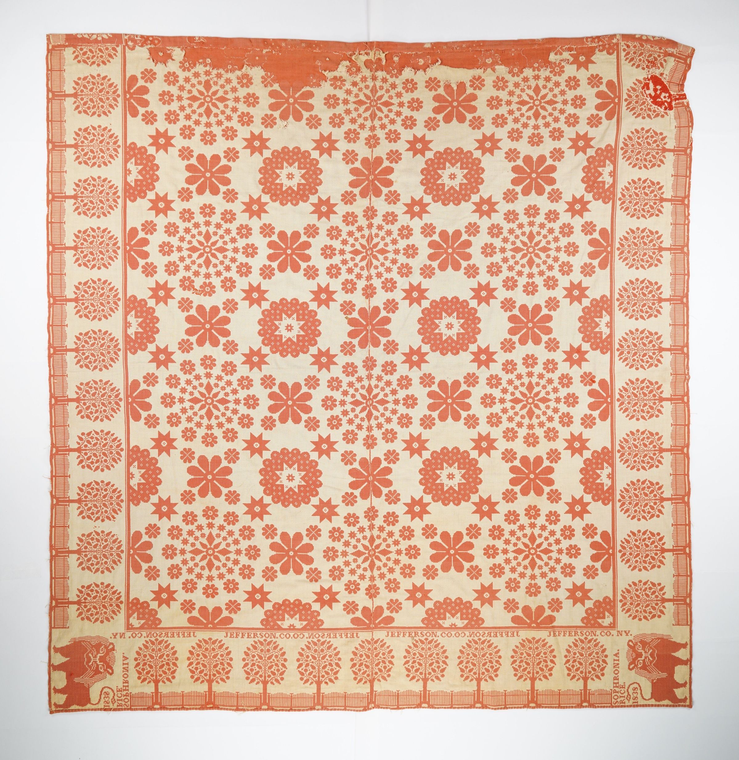 Figured and fancy doubleweave coverlet with borders on 3 sides and no fringe. Two panels joined by a center seam. Red wool with undyed cotton. Starburst and floral centerfield pattern; tree border on sides and bottom. Woven by Harry Tyler for Sophronia Rice in 1838 with lion trademark.Context
