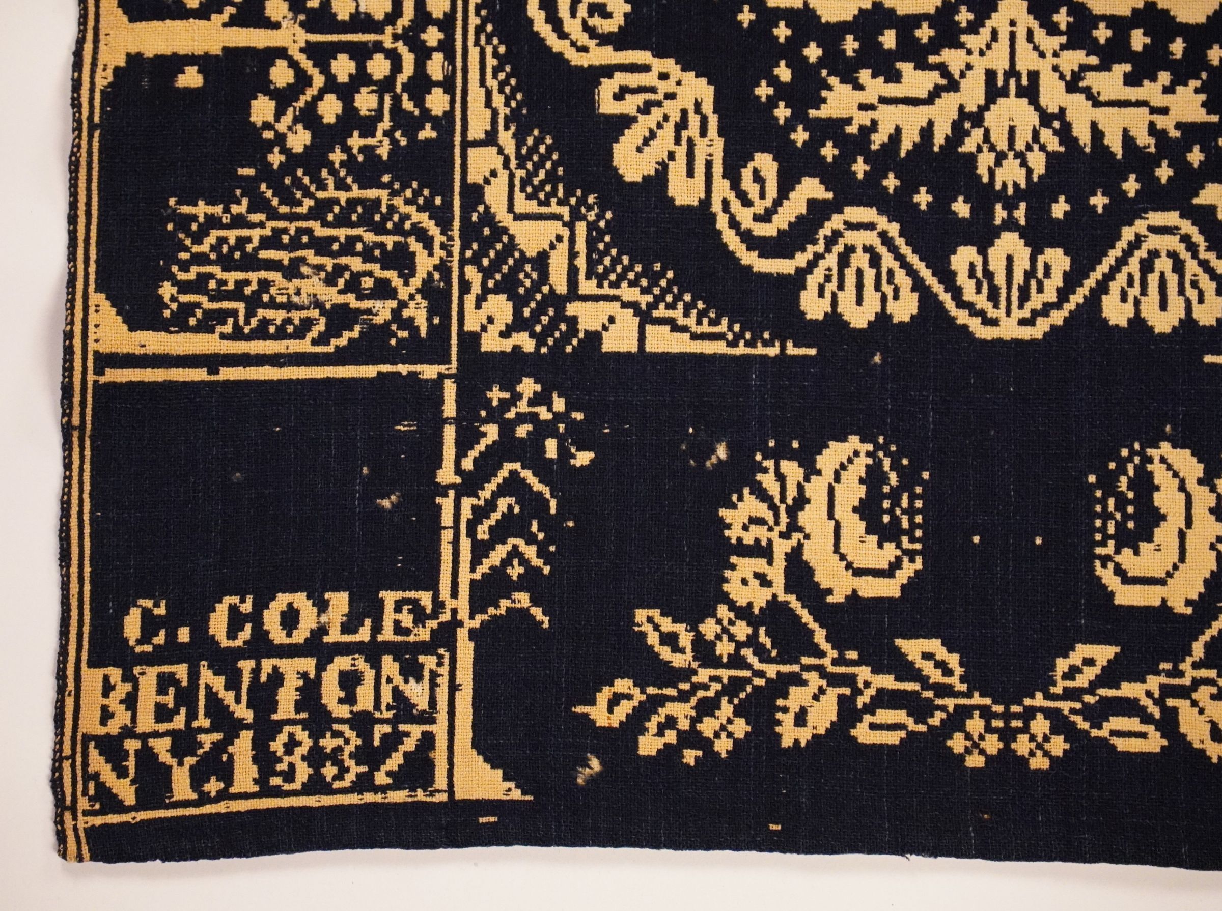 Navy and natural figured double weave coverlet with border on three sides. Two joined panels. Woven in Benton, Yates Co., New York in 1837 for C. Cole.Collection