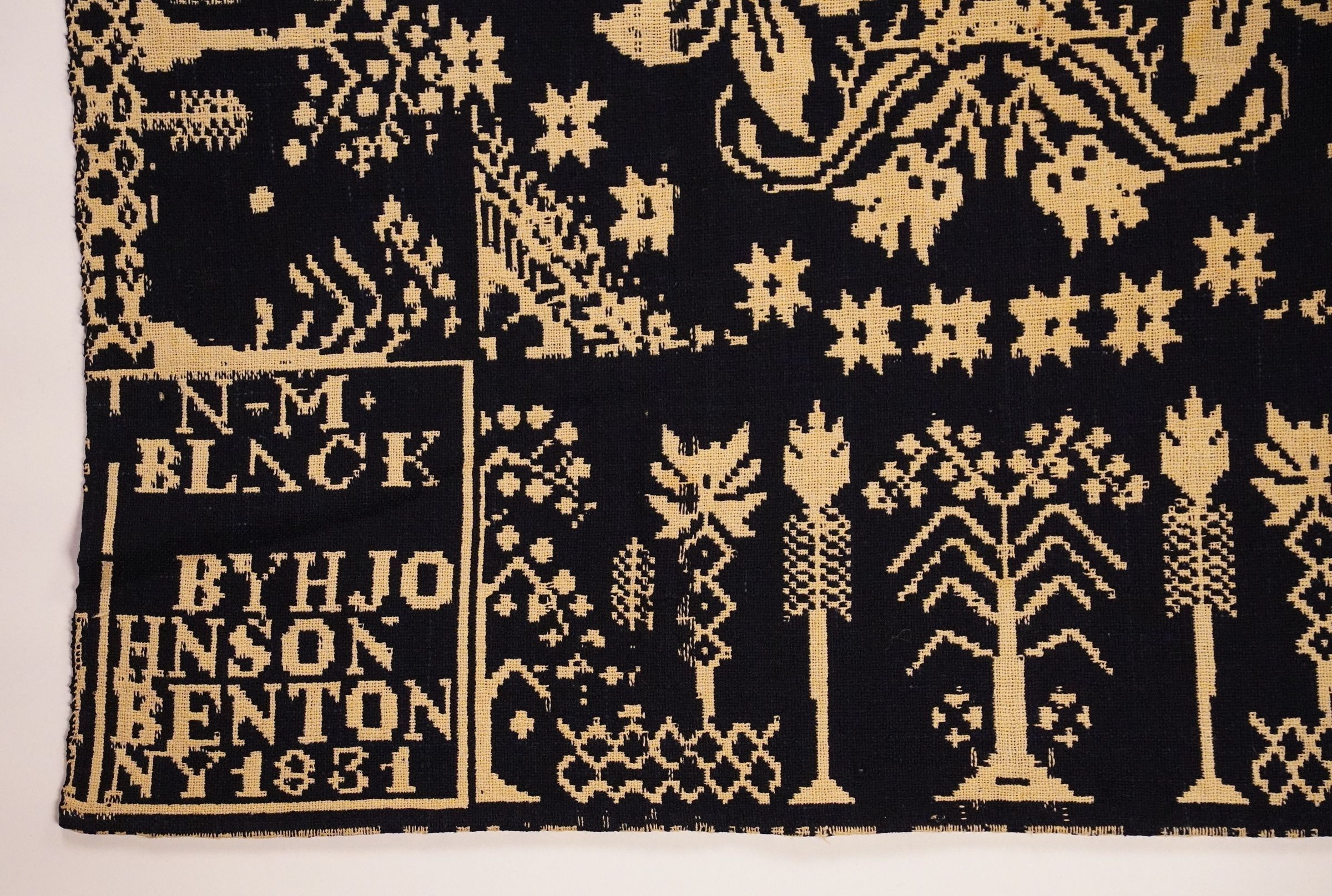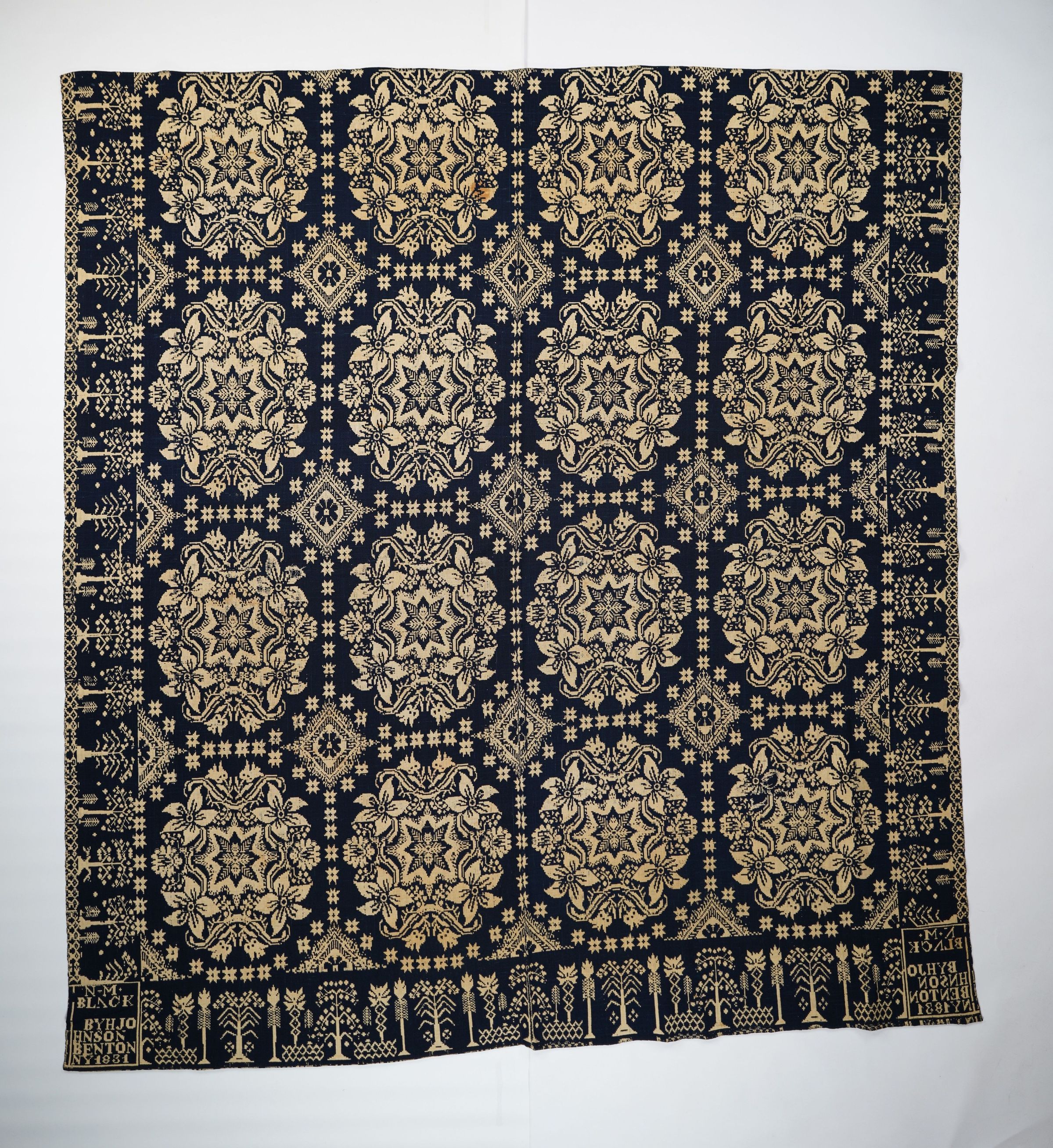 Navy and natural figured double weave coverlet with border on three sides. Two joined panels. Woven for N. M. Black by Henry Johnson in Benton, Yates Co., New York in 1831.Collection