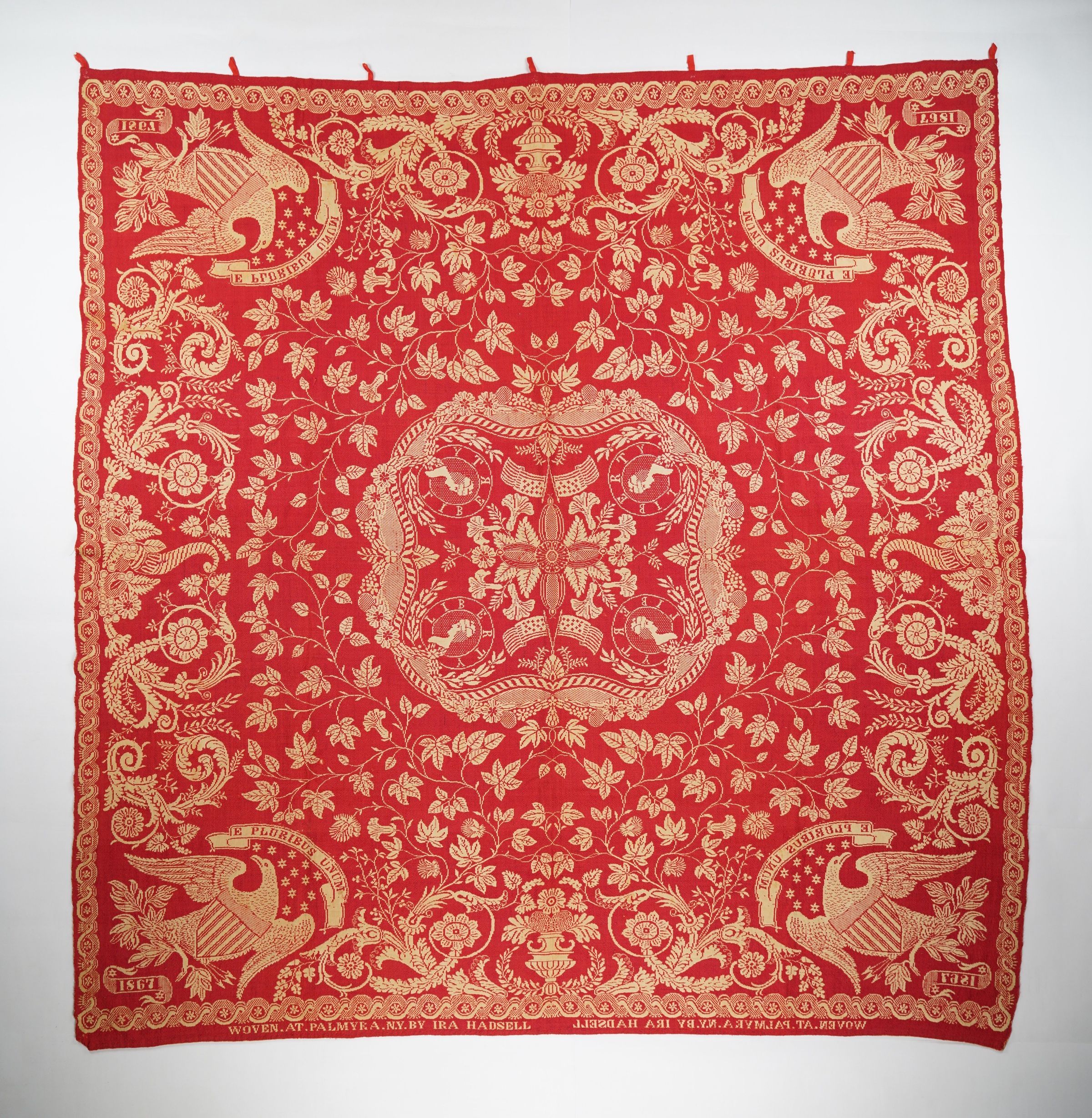 Figured and fancy doubleweave coverlet with borders on 4 sides and no fringe. Woven full-width; seamless. Red wool with undyed cotton. Liberty medallion centerfield pattern; floral eagle border on all sides. Woven by Ira Hadsell in 1867.Context