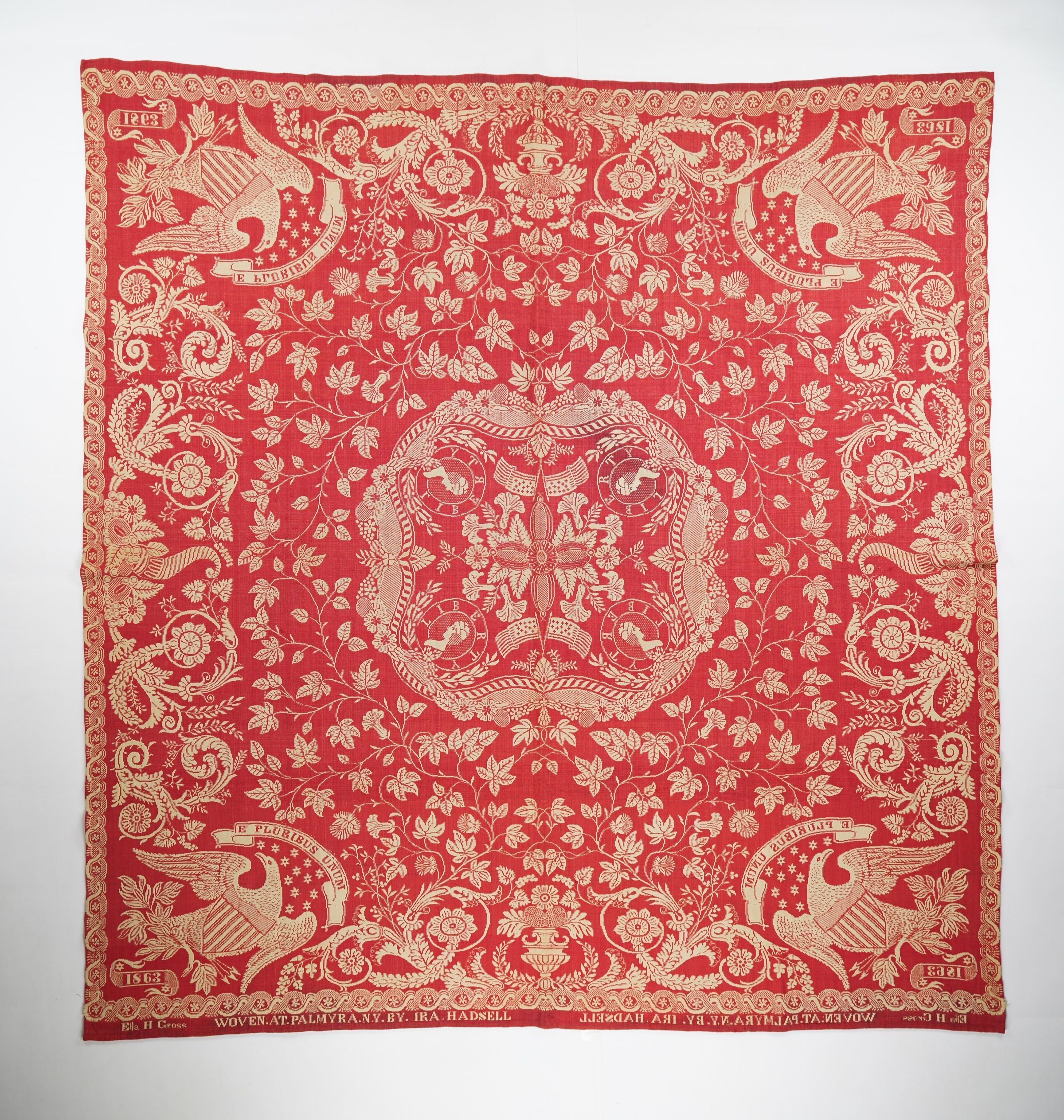 Figured and fancy doubleweave coverlet with borders on 4 sides and no fringe. Woven full-width; seamless. Red wool with undyed cotton.Liberty medallion centerfield pattern; floral urn border on all sides; eagles in cornerblocks. Woven by Ira Hadsell for Ella H. Gross in 1863.Context