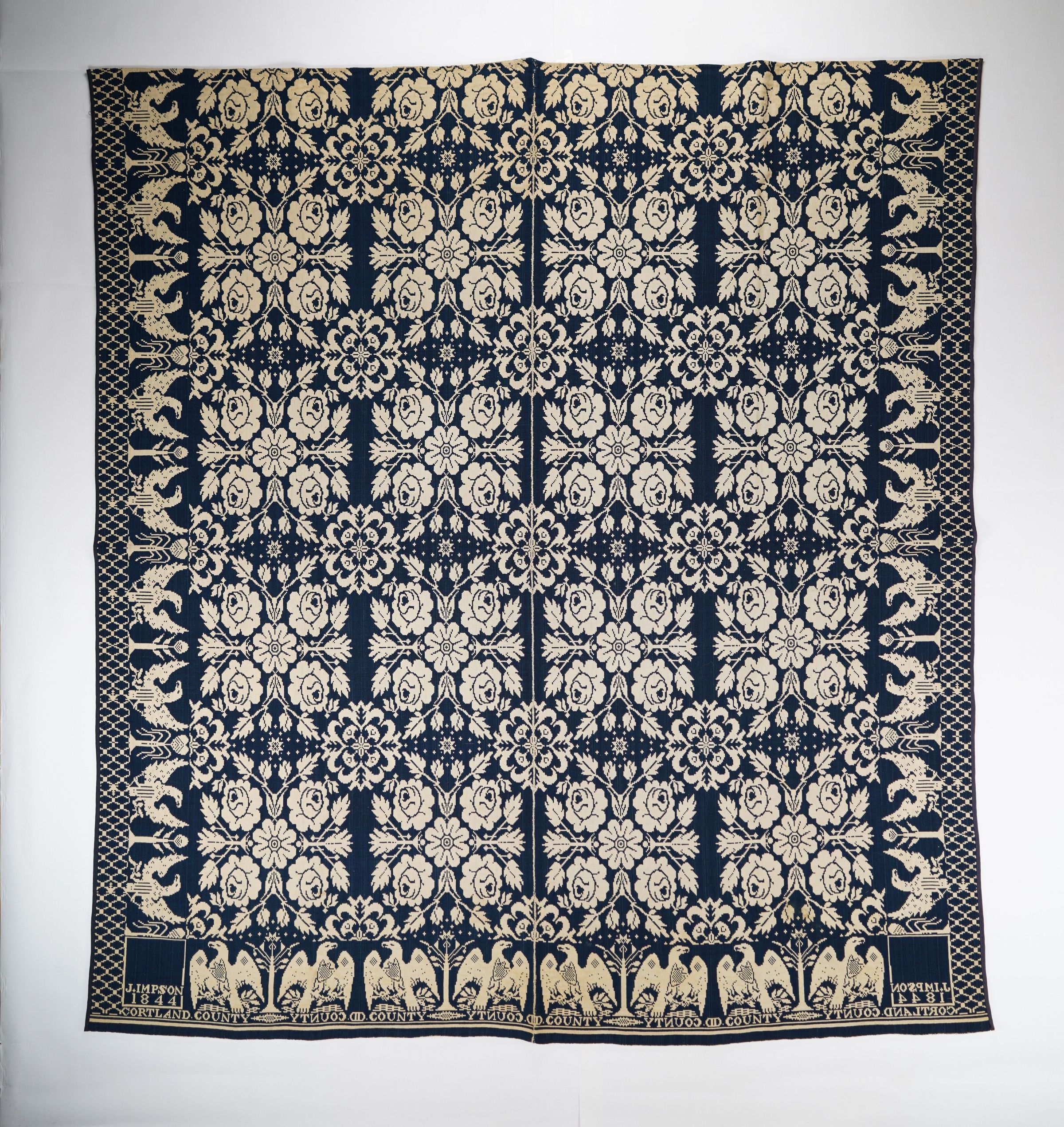 Figured and fancy doubleweave coverlet with borders on 3 sides and no fringe. Two panels joined by a center seam. Navy wool with undyed cotton. Double rose centerfield pattern; eagle and tree border on sides; perched eagle and tree border on bottom. Woven by Jacob Impson in 1844.Context