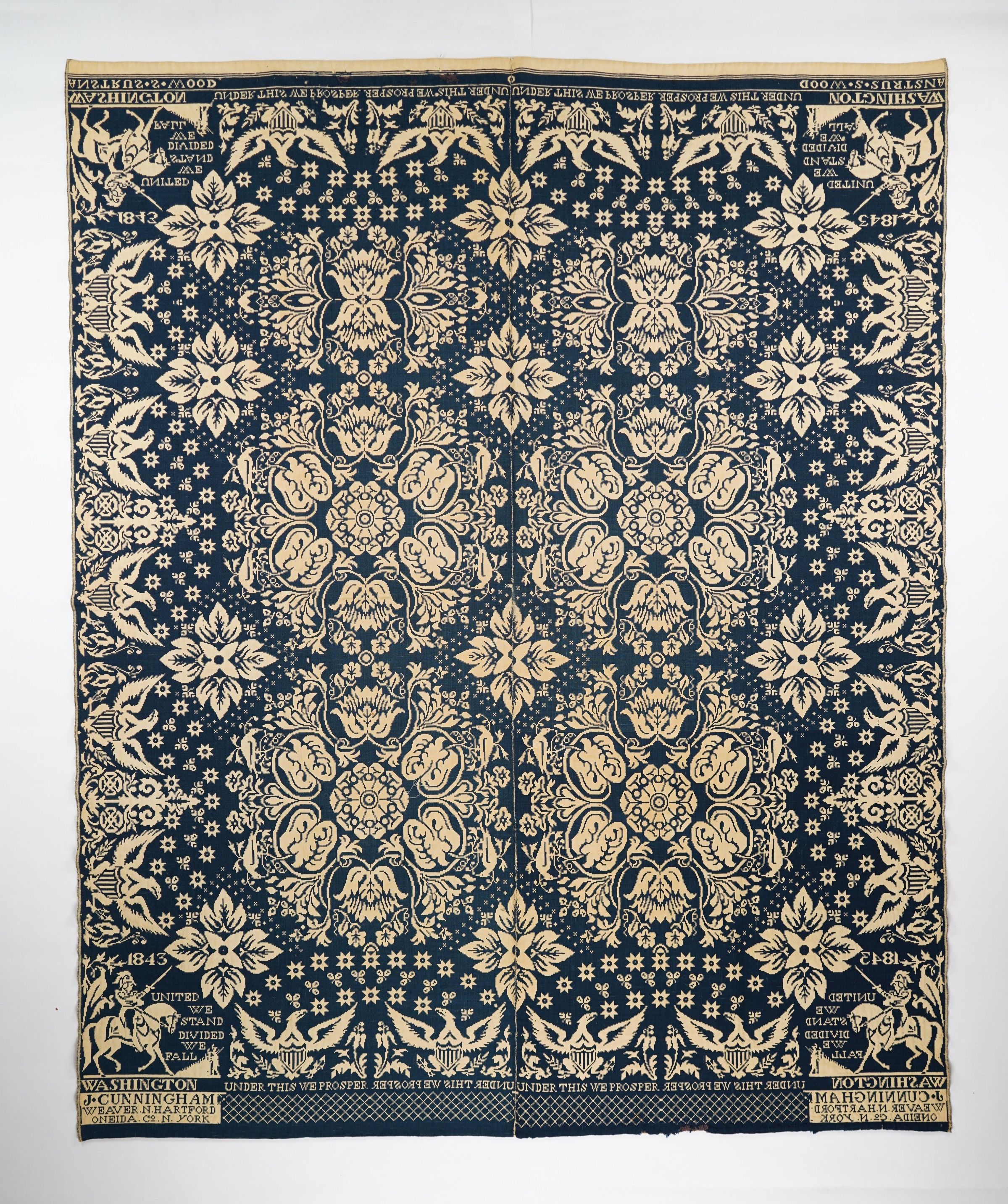 Figured and fancy doubleweave coverlet with borders on 4 sides and no fringe. Two panels joined by a center seam. Navy wool with undyed cotton. Floral centerfield pattern; eagle border on sides and bottom. Woven by James Cunningham in 1843 with Washington trademark.Context