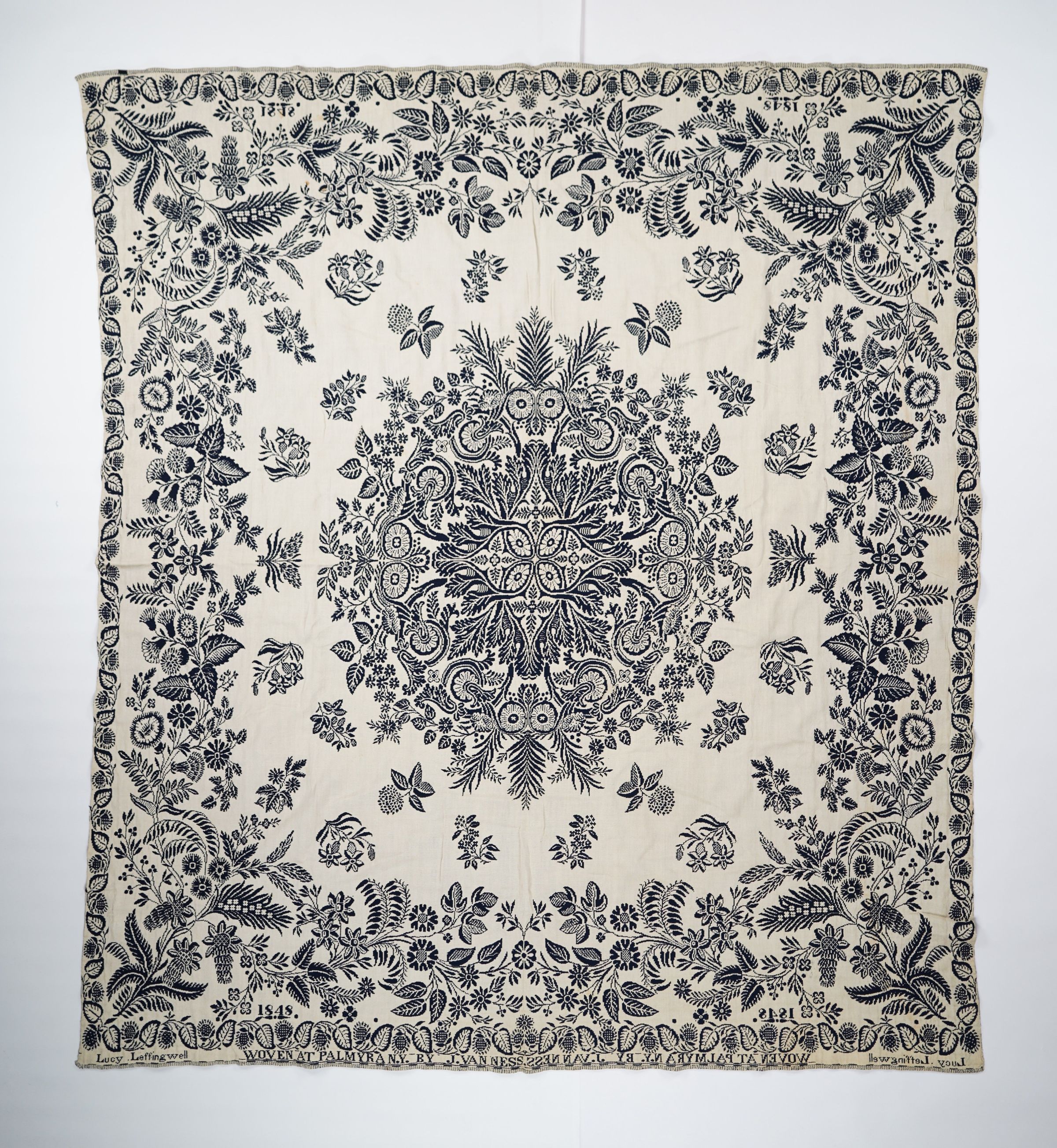 Navy and natural figured double weave coverlet with center medallion pattern. Woven by James Van Ness in Palmyra, Wayne Co., New York in 1848 for Lucy Leffingwell.Collection