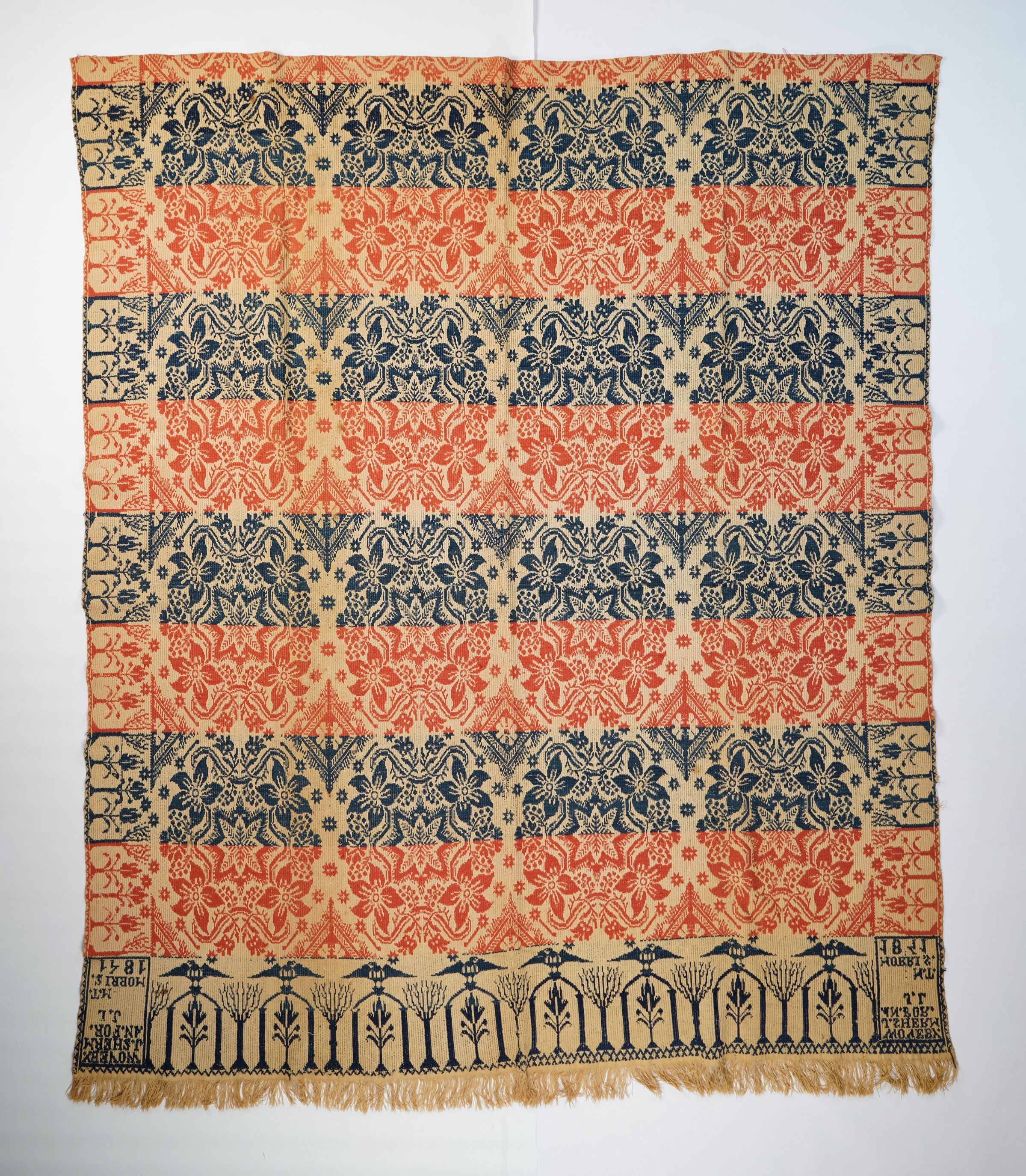 Red, navy, and natural figured tied beiderwand coverlet with border on three sides and self-fringe along bottom. Woven by Josiah Sherman for J.L. in Mount Morris in 1841.Collection