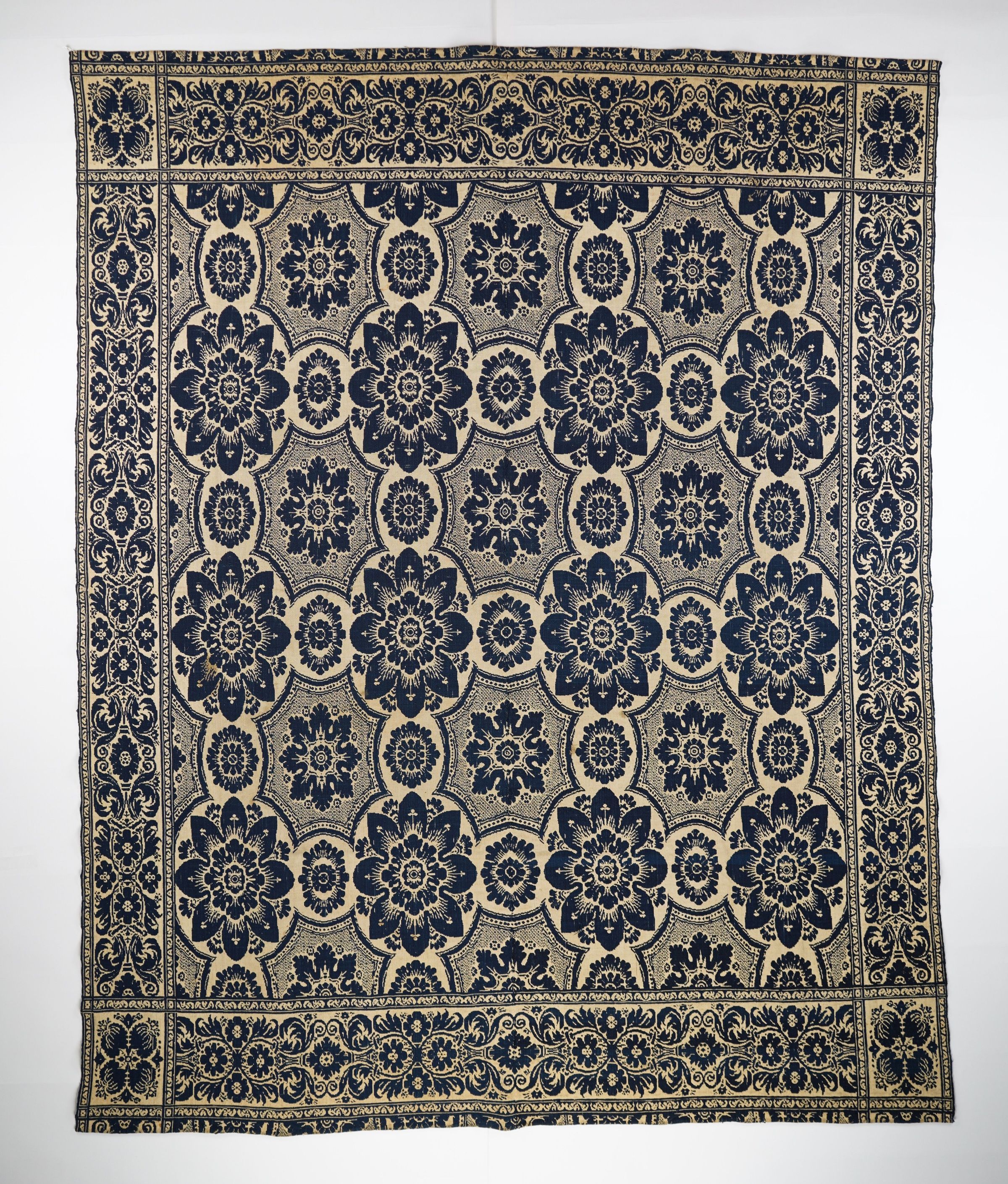 Navy and natural figured doubleweave coverlet with border around all sides. Attributed to New York.Collection