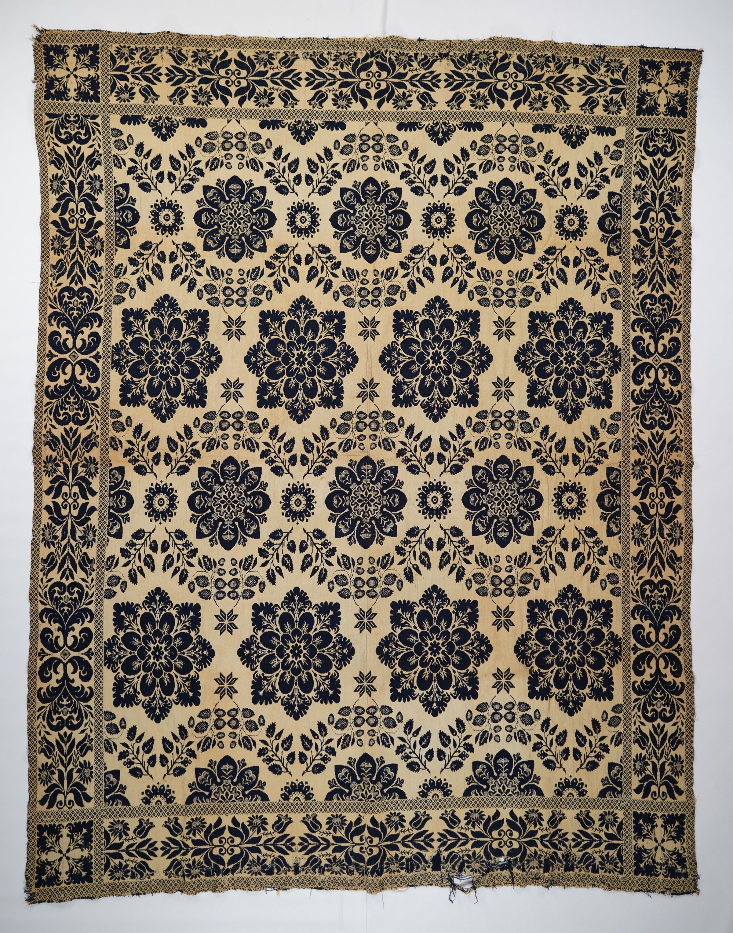 Navy and natural figured double weave coverlet with border on four sides. Seamless.