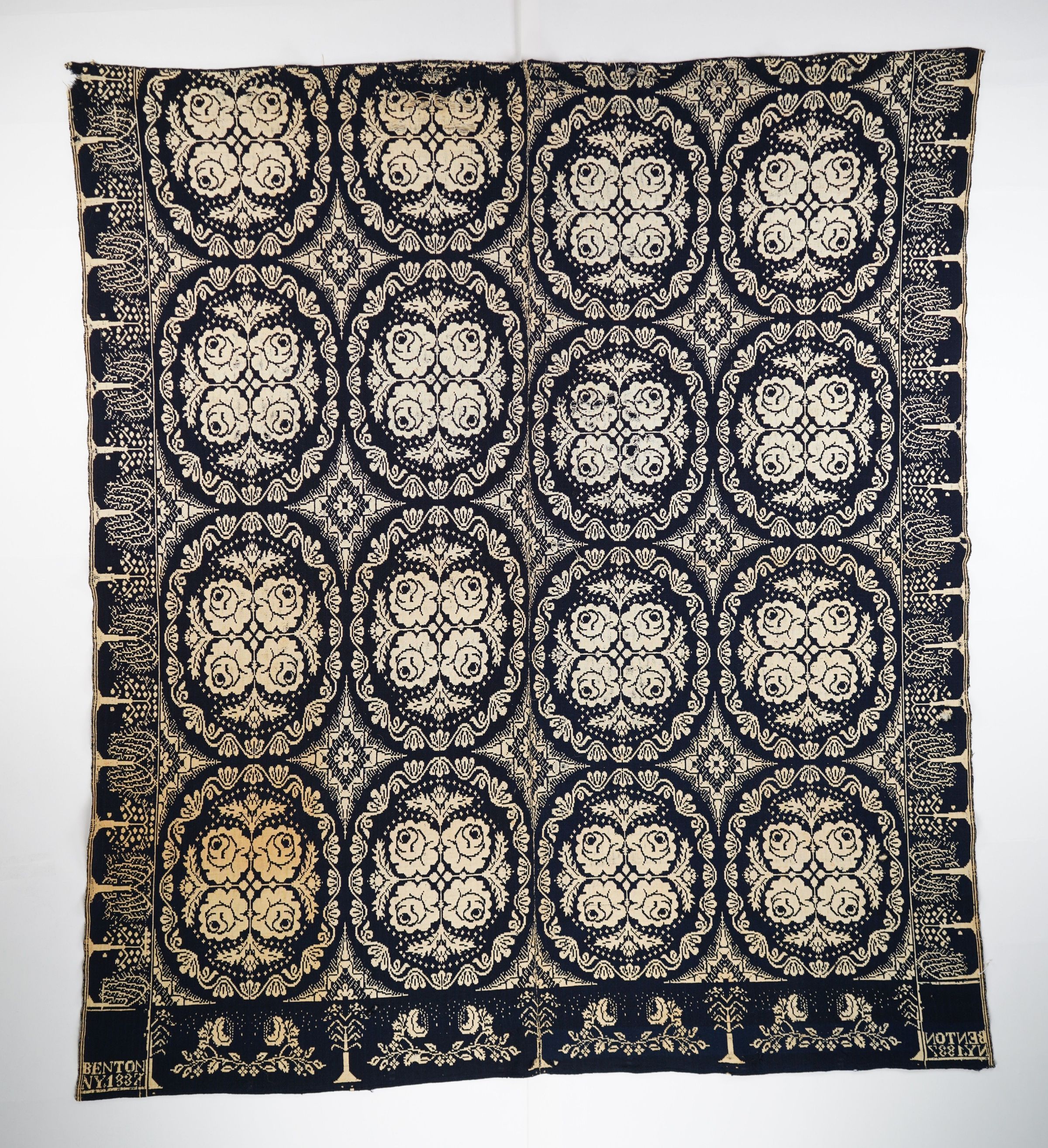 Navy and natural figured doubleweave coverlet with border around three sides. Woven in Benton, N.Y., in 1837.Collection