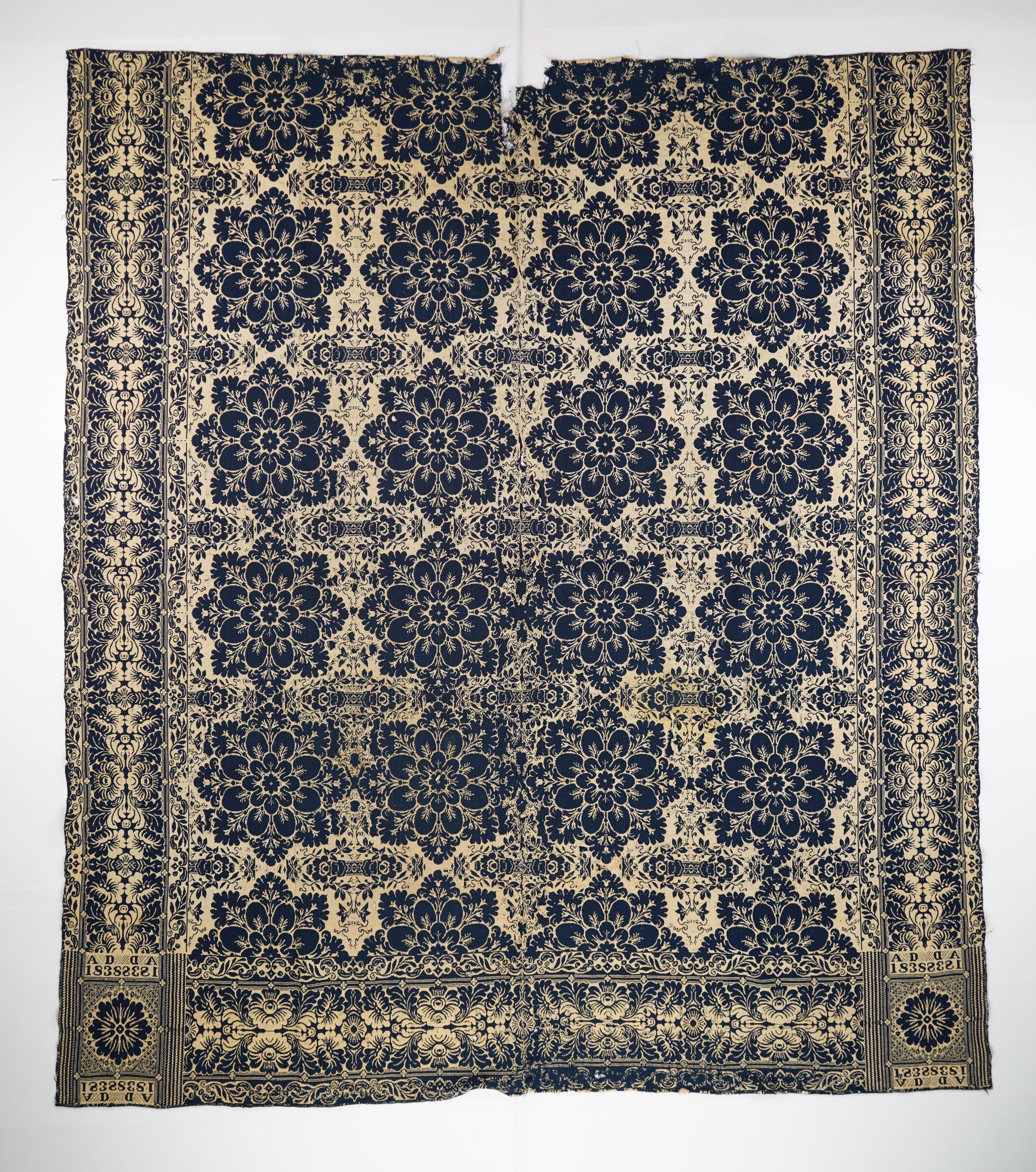 Navy and natural figured doubleweave coverlet with border around three sides. Attributed to the Rochester area in Monroe County, N.Y. Woven in 1838.Collection