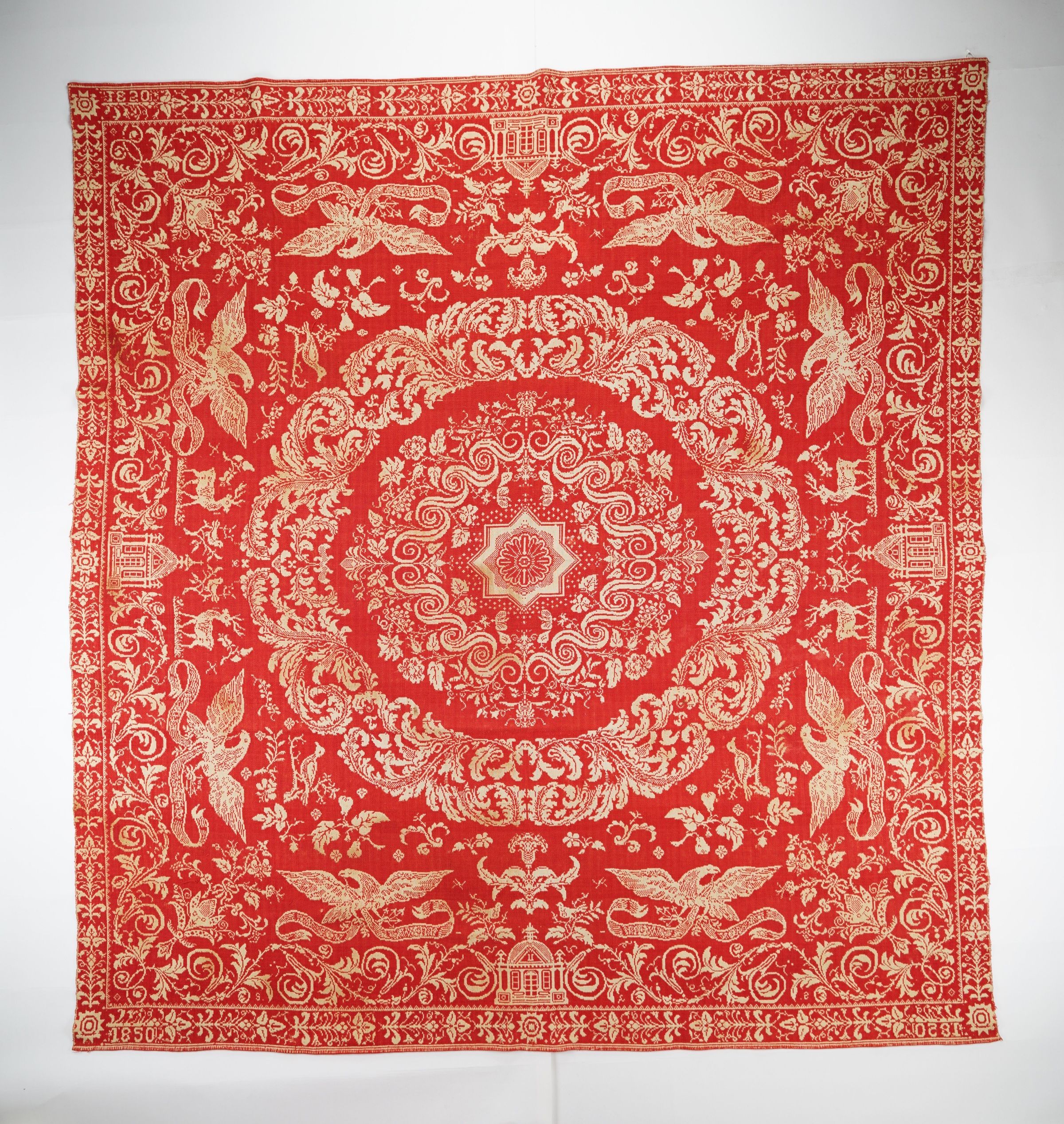 Red and natural figured doubleweave coverlet with border. Attributed to New York. Woven in 1850.Collection