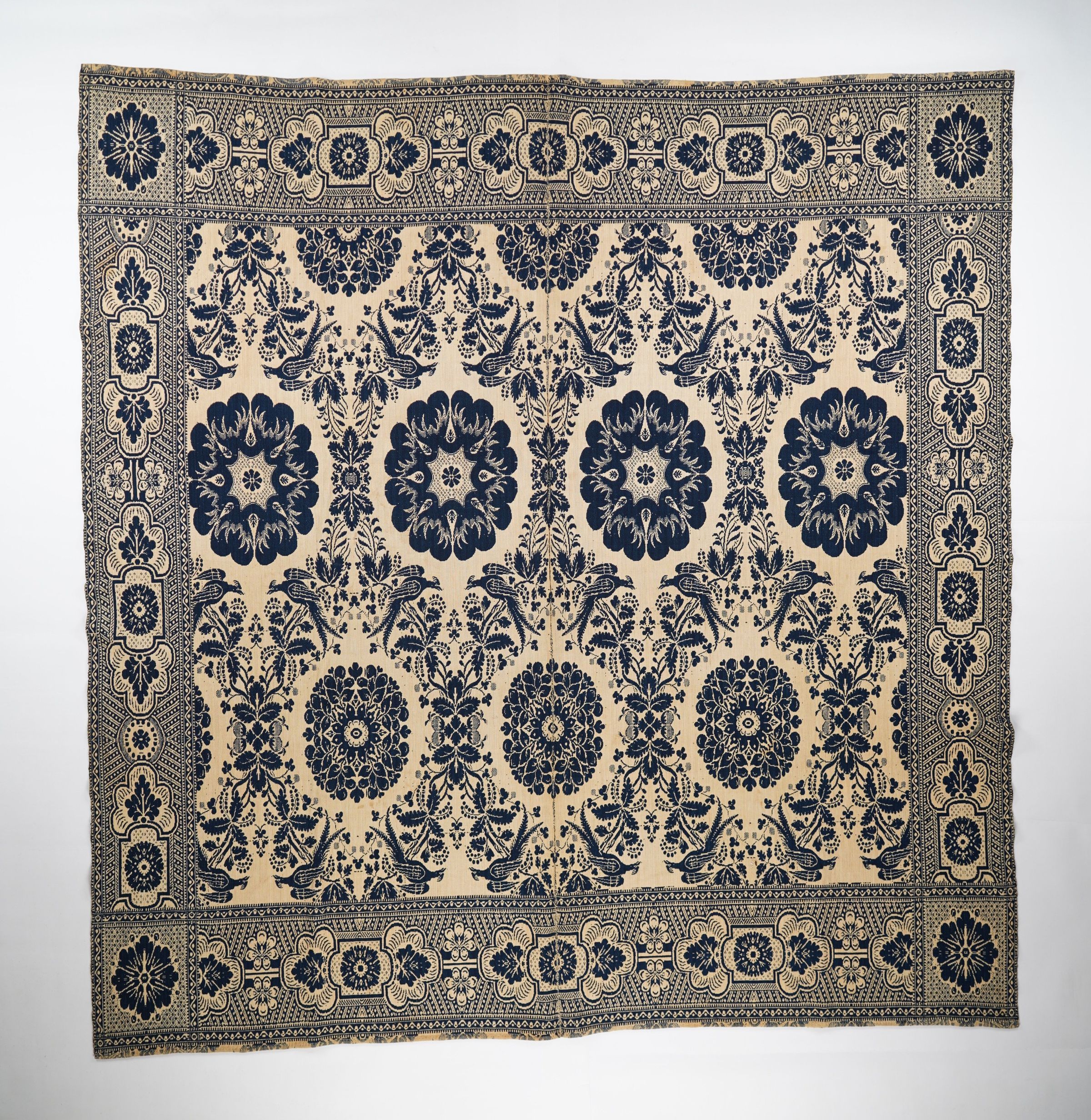 Figured and fancy doubleweave coverlet with borders on 4 sides and no fringe on sides and bottom. Two panels joined by a center seam. Navy wool with undyed cotton. Birds of Paradise centerfield pattern; floral border on sides and bottom. Unknown weaver.Context
