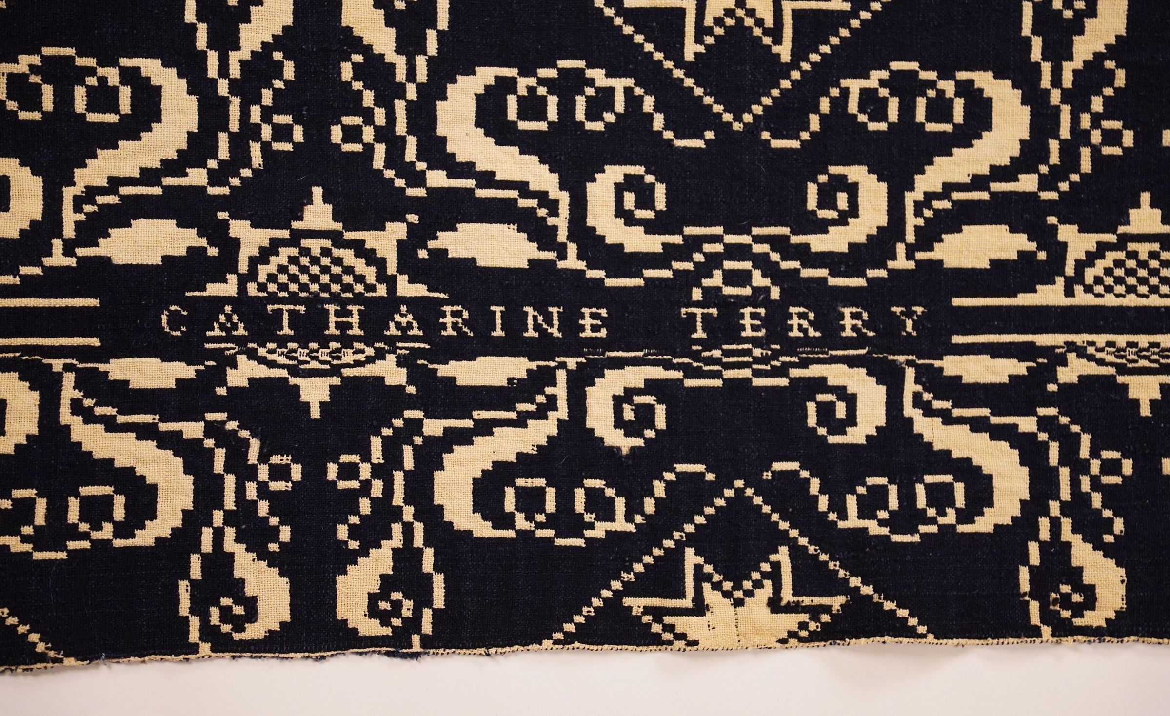 Navy and natural figured double weave coverlet with border on four sides. Two joined panels. Woven for Catharine Terry.Collection